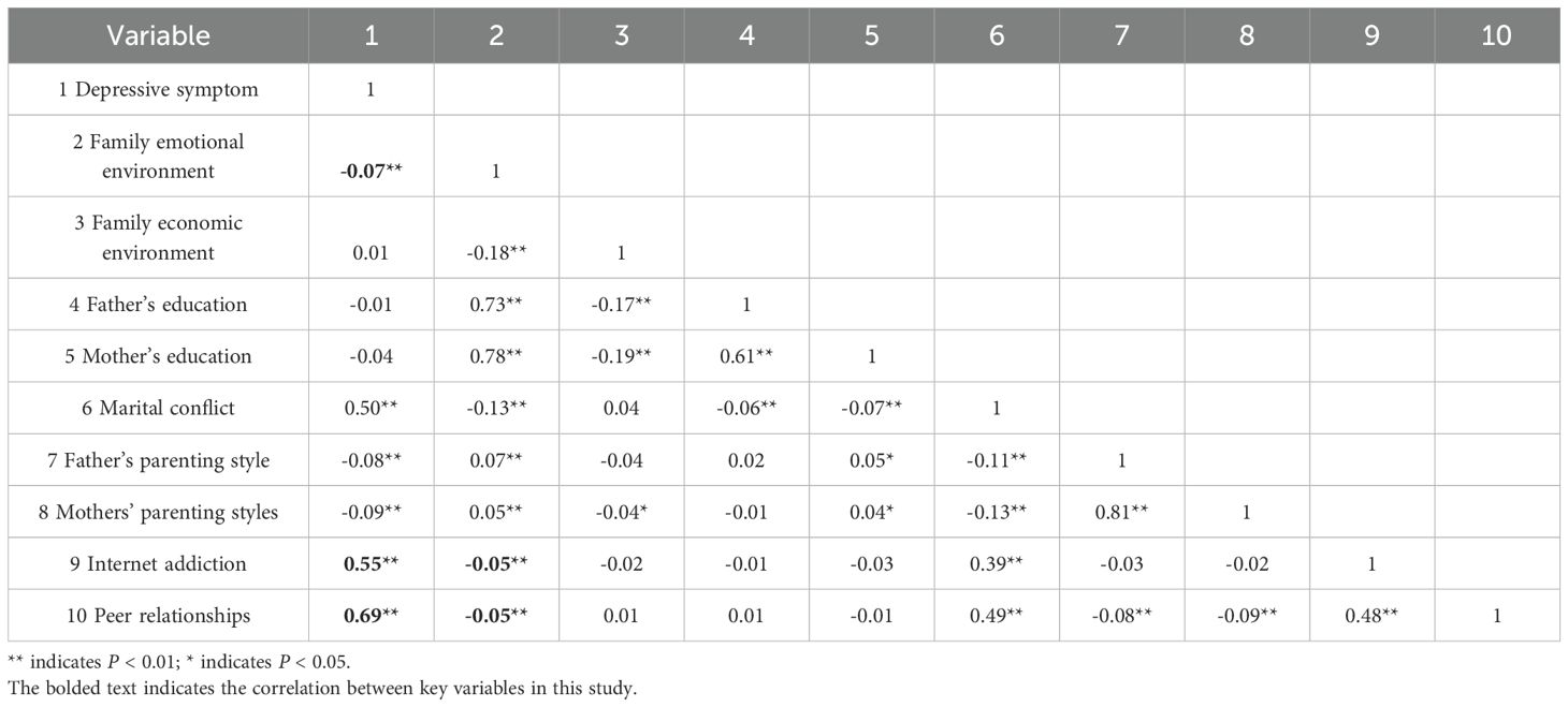 Table 2 shows the correlation matrix of study variables, indicating strong correlations between peer relationships, internet addiction, depressive symptoms, and family emotional environment, with no associations found between these variables and family economic environment.