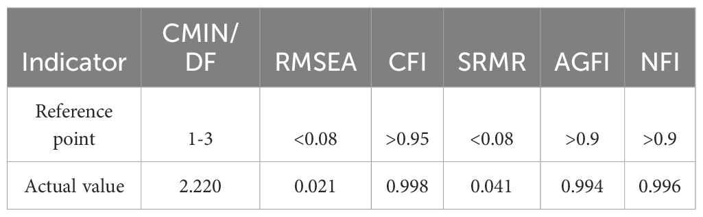 Each parameter of the structural equation model was estimated in this study using the maximum likelihood technique. AMOS 26.0 processing produced the model’s final fit. As shown in Table 3, the model fit indices CMIN/DF=2.220, RMSEA = 0.021, CFI = 0.998, SRMR = 0.041, AGFI = 0.994, NFI = 0.996, and all the fit indices are within the reference range, which indicates that the model is well fitted.