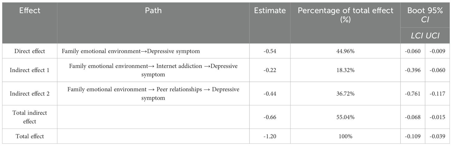 Table 4. Parallel mediating effects of Internet addiction and peer relationships between family emotional environment and depressive symptoms.