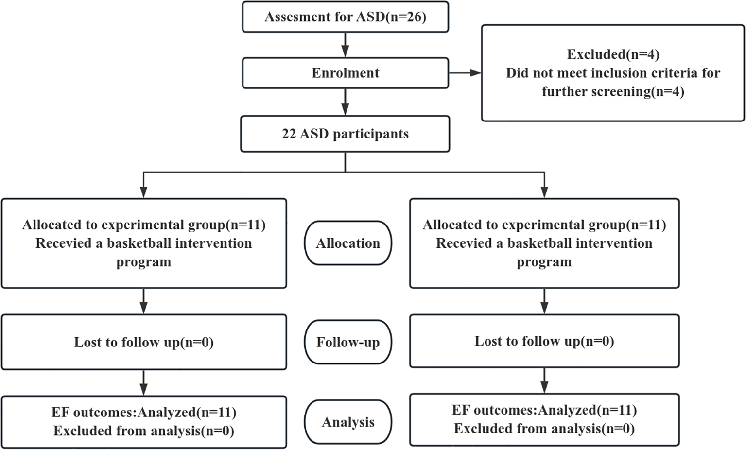 Despite prior sample size estimates (G*Power 3.1, effect size Cohen’s f = 0.35, α = 0.05, power = 0.80), detecting a moderately large interaction effect would require at least 18–22 participants per group. However, recruiting children with autism proved extremely challenging due to strict inclusion criteria, parental consent constraints, and geographical limitations. To compensate for potential statistical power limitations, this study reported observed power, Hedges’ g effect size, and 95% confidence intervals, and conducted multiple sensitivity analyses to validate the robustness of the results. Participants for this study were recruited by the author at the local autism association. Inclusion criteria: age 6–12 years, possession of a diagnostic certificate of autism from the association or a tertiary hospital, and no basketball training. Exclusion criteria: physical movement disorders, epilepsy or other sudden illnesses, violent tendencies, audiovisual disorders. Exclusion and exclusion criteria: inability to participate in the full training program, voluntary request to withdraw from the study in the middle of the study. The above criteria are intended to exclude the influence of various unforeseen factors on the experimental intervention. According to the above criteria, a total of 26 children with autism were recruited, of which 4 parents indicated that the intervention site was far away and could not attend on time, so the final number of autistic children participating in the study was 22. Using computer-generated random sequences, subjects were assigned to the experimental and control groups in a 1:1 ratio via block randomization. The random sequence was generated by an independent statistician not involved in subject recruitment or allocation. Allocation concealment were sealed in sequentially numbered, opaque envelopes and executed within the centralized randomization system, with 11 in the control group (7 males/4 females) and 11 in the experimental group (8 males/3 females). The experimental group participated in basketball training for 12 weeks, 3 times per week, 60min/time,. Meanwhile the control group did not participate in any sports activities of the same type. Written informed consent was obtained from the parents or legal guardians of the study participants prior to their participation in the study. All methods were performed in accordance with the relevant guidelines and regulations. For research involving human participants, the study was conducted in accordance with the Declaration of Helsinki. The demographics of the experimental subjects were analyzed in Table 1. The overall experimental design process is shown in Figure 1 below.