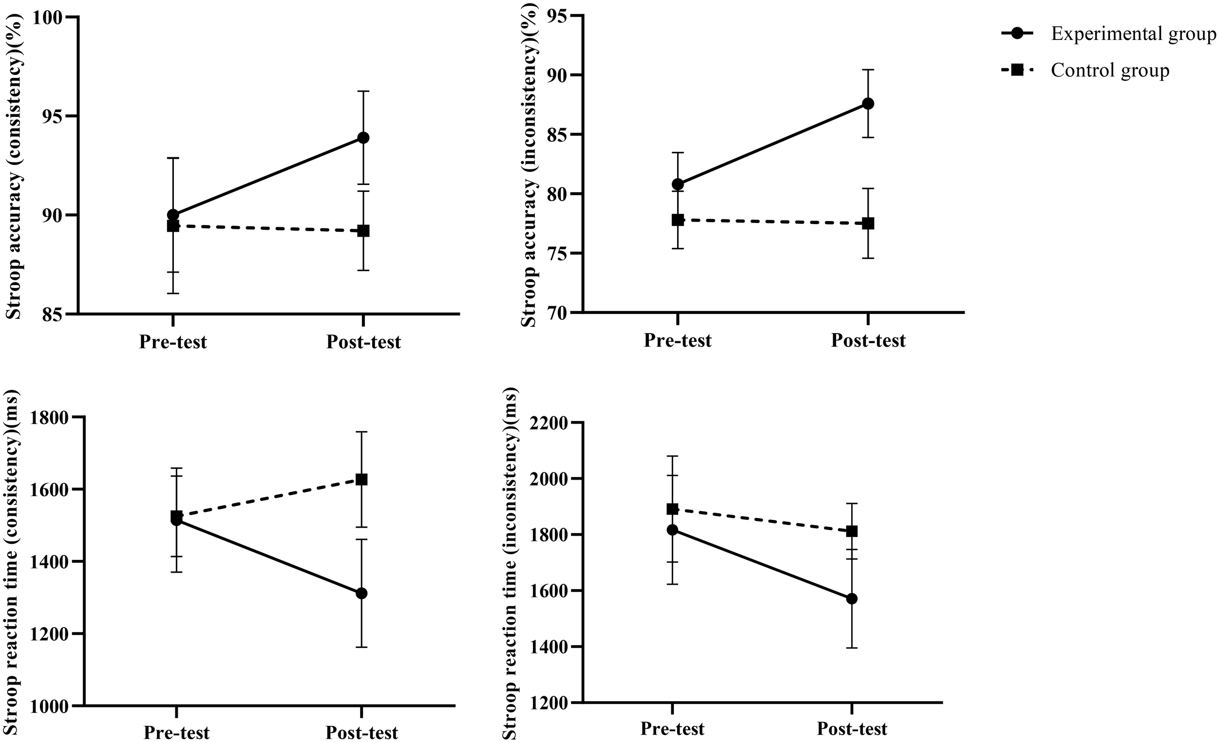 As shown in Table 4, the intervention group exhibited significant group × time interaction effects across all Stroop task metrics (all P < 0.001). Accuracy improvement was particularly pronounced under the incongruent condition (Adjusted mean difference = 6.71, Hedges’ g = 3.02), accompanied by a significant reduction in reaction time (Adjusted mean difference = −165.80, Hedges’ g = −1.94). Results under the congruent condition also supported significant improvements in executive control and processing speed for the intervention group. These findings indicate that the intervention effectively enhanced participants’ inhibitory control and conflict resolution abilities.