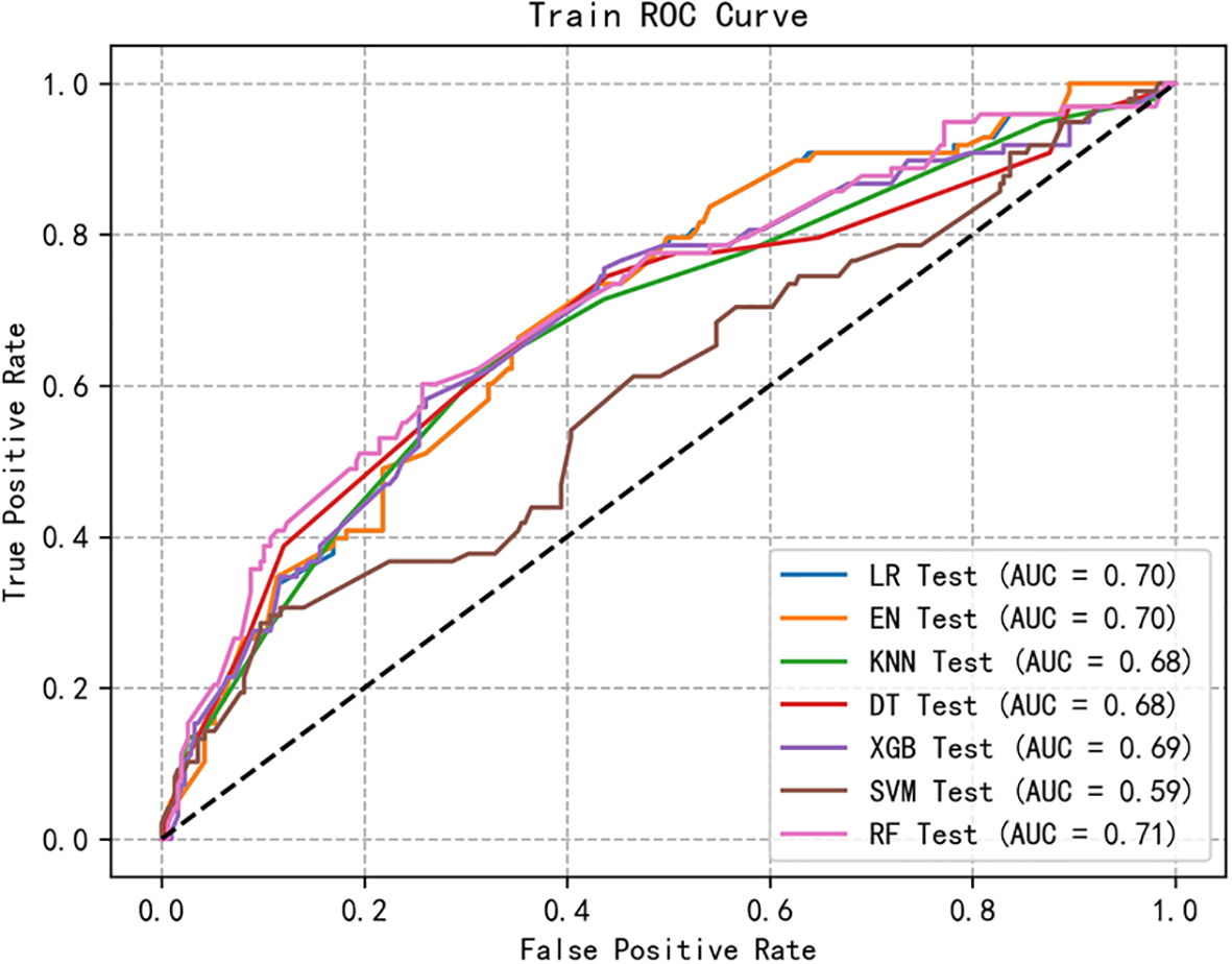 Statistical analyses were performed using SPSS 27.0. Categorical variables are presented as frequencies and percentages (n, %). Between-group comparisons were conducted using Chi-square tests, while potential risk factors were identified through logistic regression analysis (P<0.05). The processing dataset split into a training set (70%) and a testing set (30%). We then use these preselected features into seven different ML models: logistic regression (LR), elastic network (EN), K-nearest neighbor (KNN), decision tree (DT), extreme gradient enhancement (XGBoost), support vector Machine (SVM), Random Forest (RF). For each model, we select a set of hyperparameters that maximize the AUC of the ROC on the training set by using a 5-fold Cross Validation and Grid Search method, thus ensuring optimal performance and efficient prediction and comparison of the test set. The models have been cross- Validated in five times to ensure robustness and reliability. Comparing the models, we select the best model based on the AUC values and create the Shapley Additive exPlanations (SHAP) interpreter to calculate the SHAP values, representing each feature’s contribution to the predicted results, and we draw a SHAP summary diagram of RF model to illustrate the effects of model features.