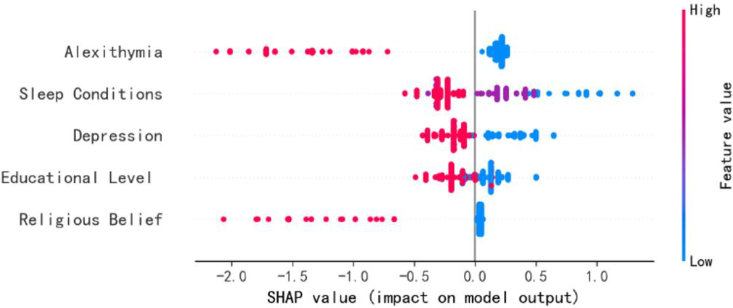 The area under the Area Under Curve (AUC: 0.71) of the random forest model was the highest among the 7 models that predicted nursing students’ social anxiety. The most important characteristics that predicted social anxiety in nursing students included Sleep condition, alexithymia, depression, education level, and religious belief.