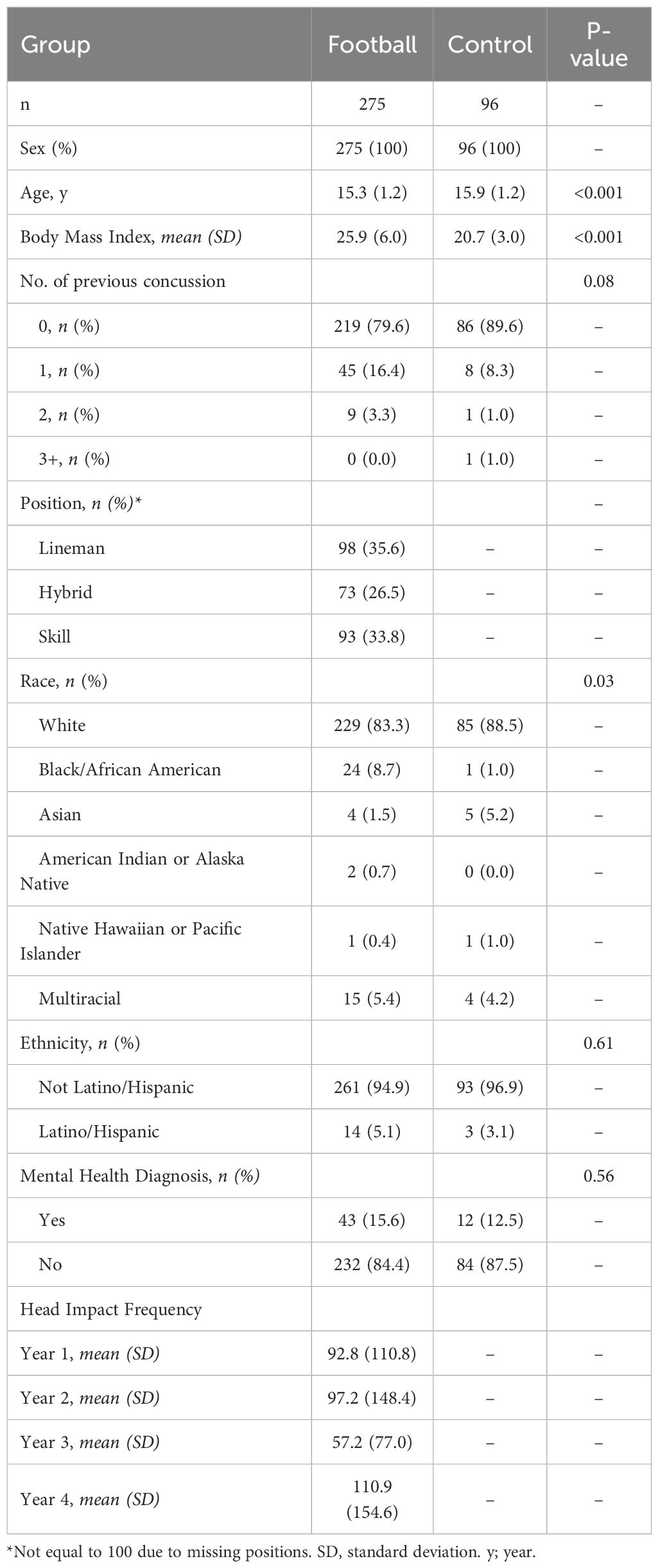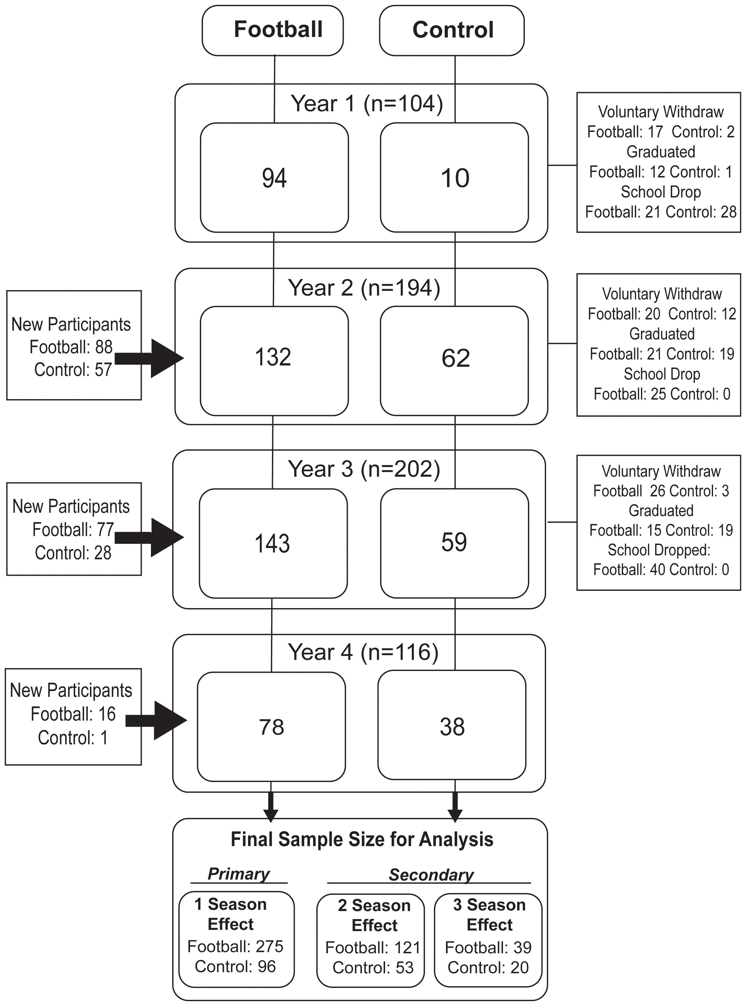 A total of 371 adolescent athletes participated in the study, including 275 high school football players (mean [SD] age, 15.3 [1.2] years) and 96 non-contact control athletes (mean [SD] age, 15.9 [1.2] years) throughout 4 years of study. Participants completed varied durations of the study (Figure 1). Sample sizes contributed to our analyses were: 1st season (n=275 football, n=96 control), 2 consecutive seasons (n=121 football, n=53 control), and 3 consecutive seasons (n=39 football, n=20 control). Given the limited sample size participating in the 4 consecutive seasons, their data up to 3 seasons were included in the analyses. Football players were slightly younger, had a higher body mass index (BMI), and more racially diverse than the control athletes. See Table 1 for demographics.