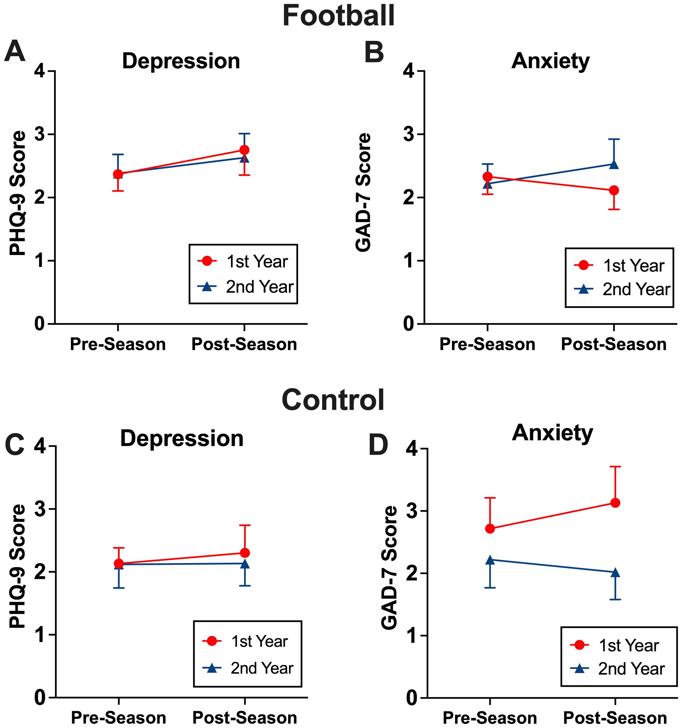 Results: A total of 371 adolescent athletes participated in this longitudinal study, including 275 high school football players (mean [SD] age, 15.3 [1.2] years) and 96 non-contact control athletes (mean [SD] age, 15.9 [1.2] years), with varying lengths of participation across 4 years of study. Depression and anxiety symptoms remained consistent across 1 season (pre vs. postseason) in both groups, as illustrated by non-significant group by time interaction in PHQ-9 [b=-0.11, 95%CI(-0.98, 0.76), p=0.814] or GAD-7 [b=0.09, 95%CI(-0.62, 0.79), p=0.806]. The same pattern was observed for those who participated in 2 consecutive seasons [PHQ-9 b=-0.01, 95%CI (-0.96, 0.98), p=0.980; GAD-7 b=0.42, 95%CI(-0.43, 1.27), p=0.33]. However, among those with 3 consecutive years of participation, there was significant seasons (pre vs. post) by year (1st vs. 3rd year) interaction in depression symptoms in the football group [PHQ-9: b=1.50, 95%CI (0.32, 2.66), p=0.015], a pattern not observed in the control group.