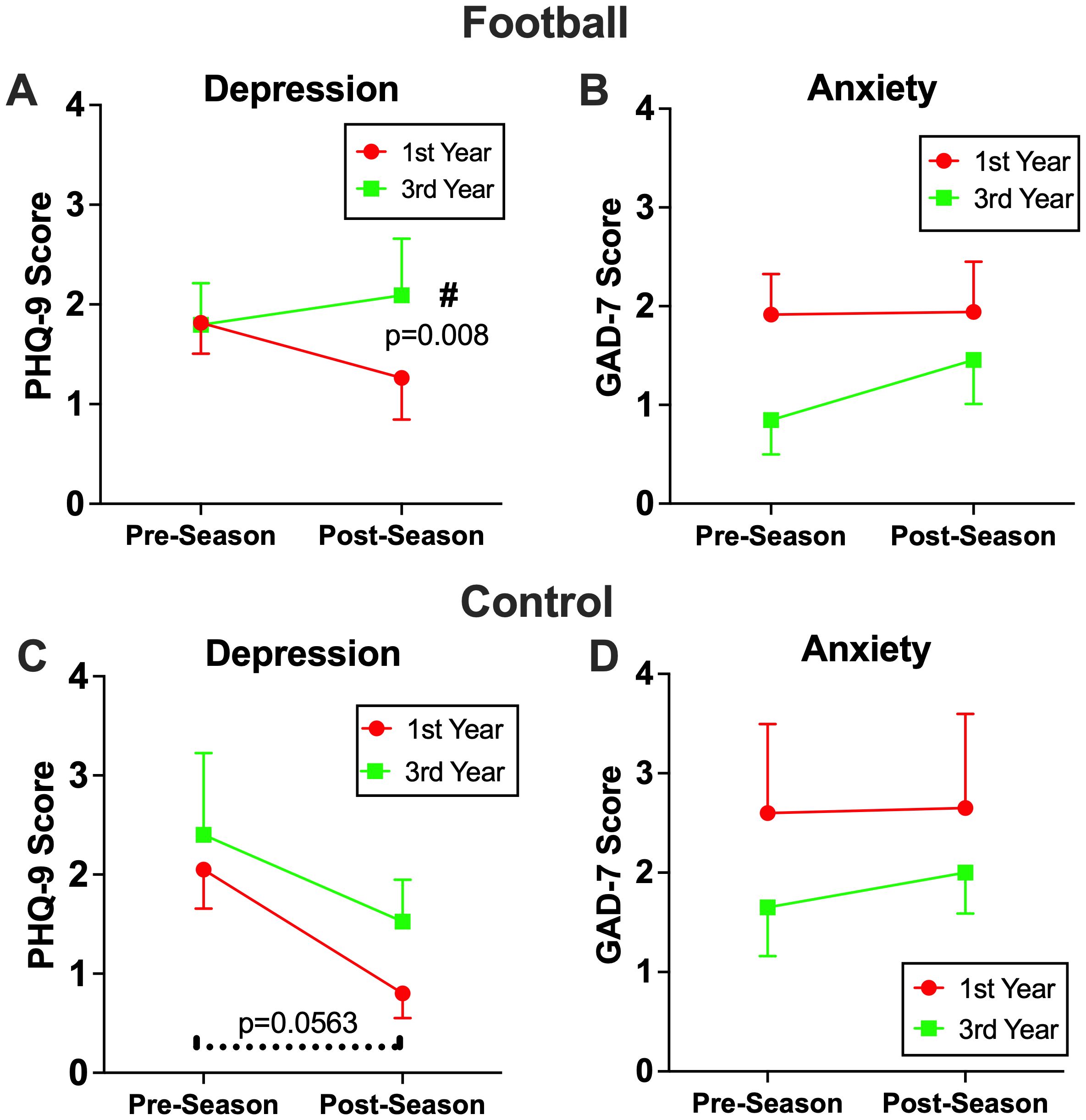 Figure 4. The effects of three consecutive season on mental health. Among football players who participated three consecutive seasons, significantly higher levels of depression symptoms (A), but not anxiety (B), were observed after their 3rd season compared to their 1st season (p=0.0148), which resulted in a significant group by time interaction (p=0.033). The control group exhibited decrease in depression symptoms in both their 1st and 3rd season (C), while anxiety symptoms remained consistent across both seasons remained consistent across both seasons (D).