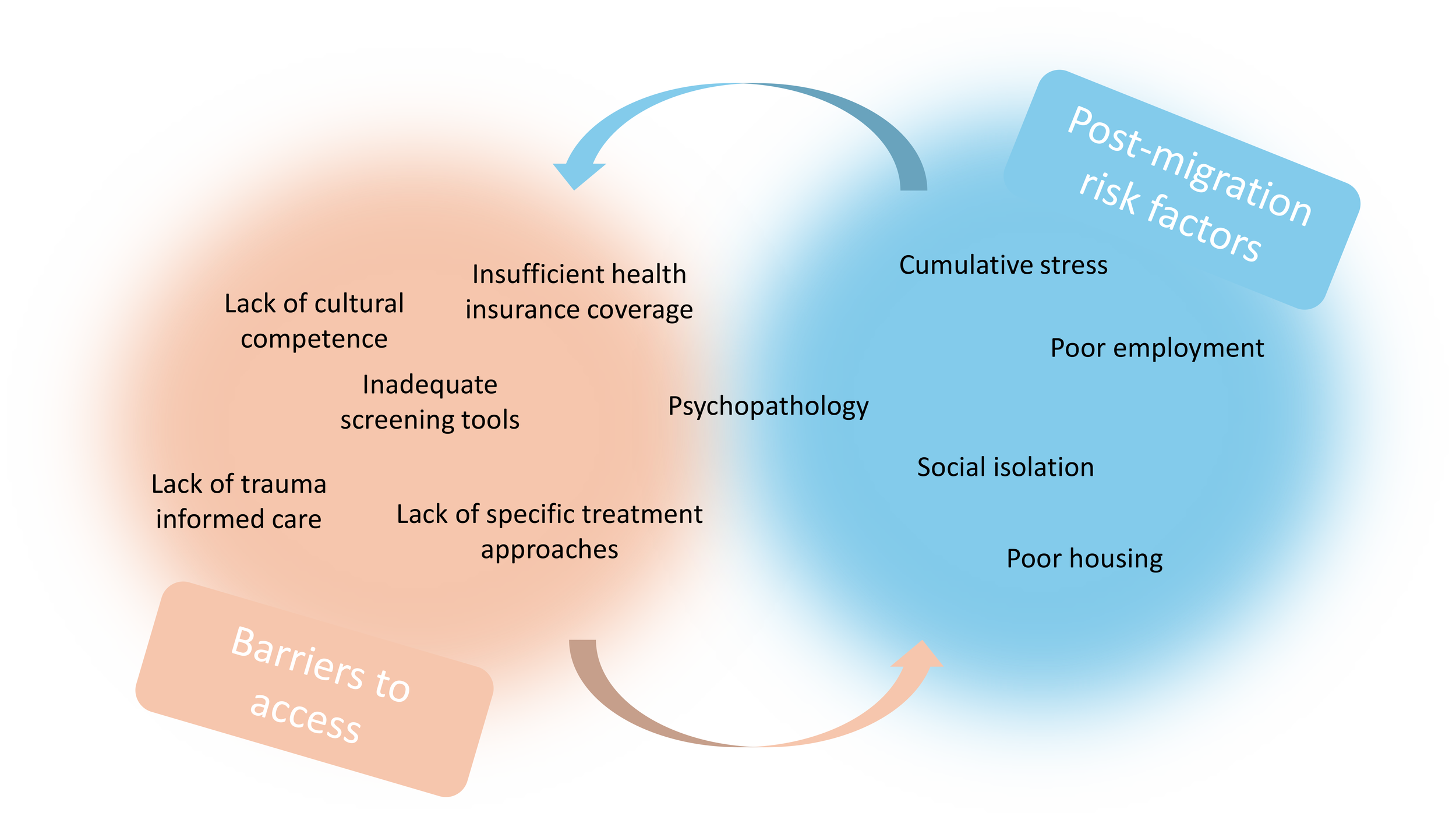 asylum seekers, barriers to treatment, post-migration risk factors, mental health policies, circular reinforcement