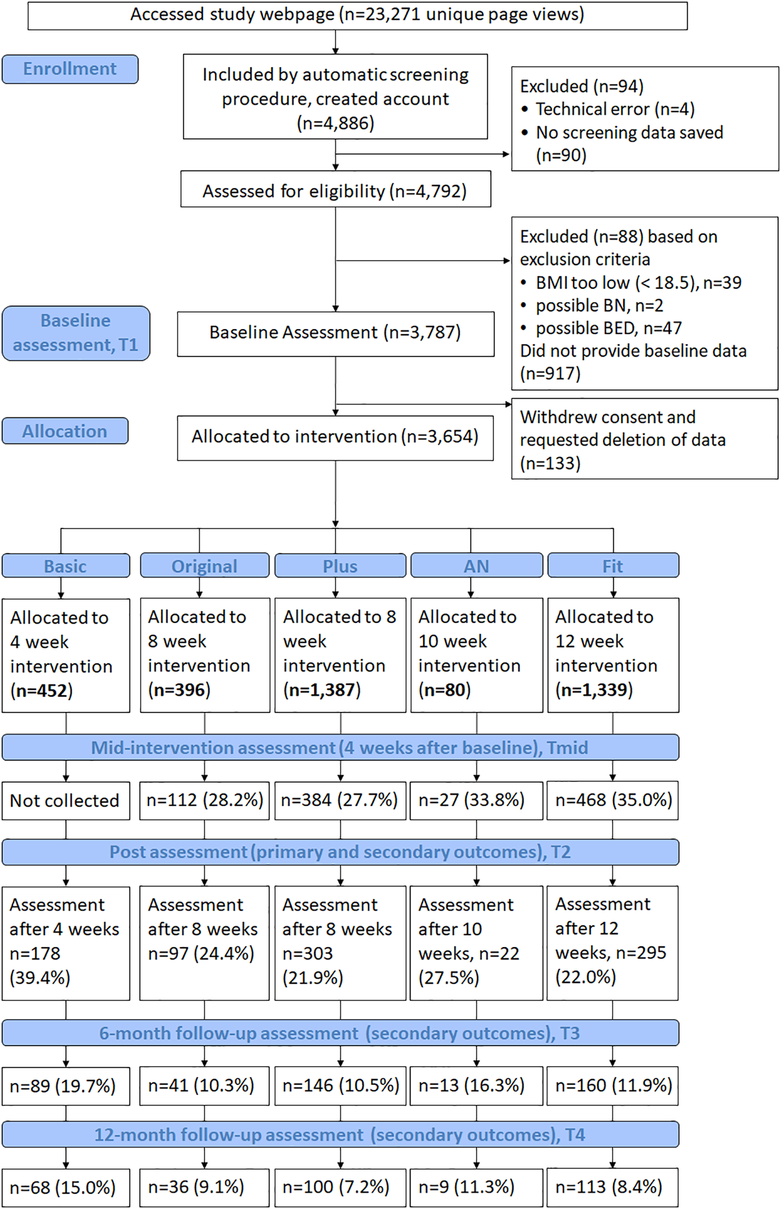 In total, 4,886 women were screened, 3,787 provided data for the baseline assessment and 3,654 were allocated to one of the five study arms. Of those, 452 were allocated to the study arm Basic, 396 to Original, 1,387 to Plus, 80 to AN, and 1,339 to study arm Fit. Figure 2 presents the number of reached, screened, included, allocated and assessed participants in total and per study arm. Group sizes are based on whether any data was collected during the respective assessments, regardless of the collection of the primary outcome. Therefore, it is possible that the sample size for a specific study arm and time point is greater that the number of collected WCS (primary outcome) data.