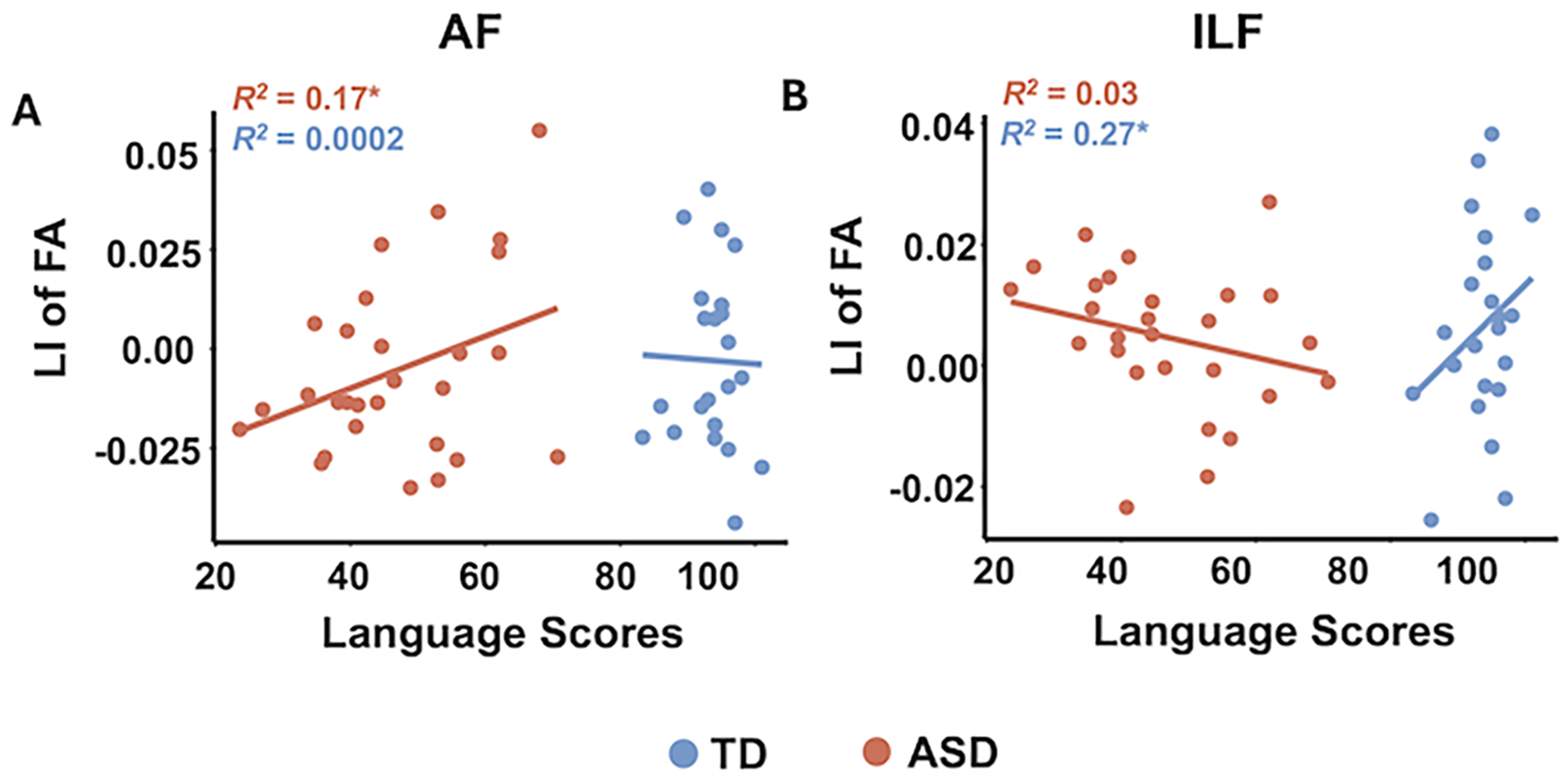 Figure 2. Scatterplots presenting significant associations between the LI of FA in the Arcuate Fasciculus (AF) and language scores in the ASD group (A), and significant associations between the LI of FA in the inferior longitudinal fasciculus (ILF) and language scores in the TD group (B). The R2 values were calculated from partial correlation analysis, controlling for age and sex. Significant results corrected for multiple corrections using permutation tests with 5,000 iterations (p < 0.05) are indicated by asterisks. Abbreviations: LI, lateralization index; FA, fractional anisotropy.