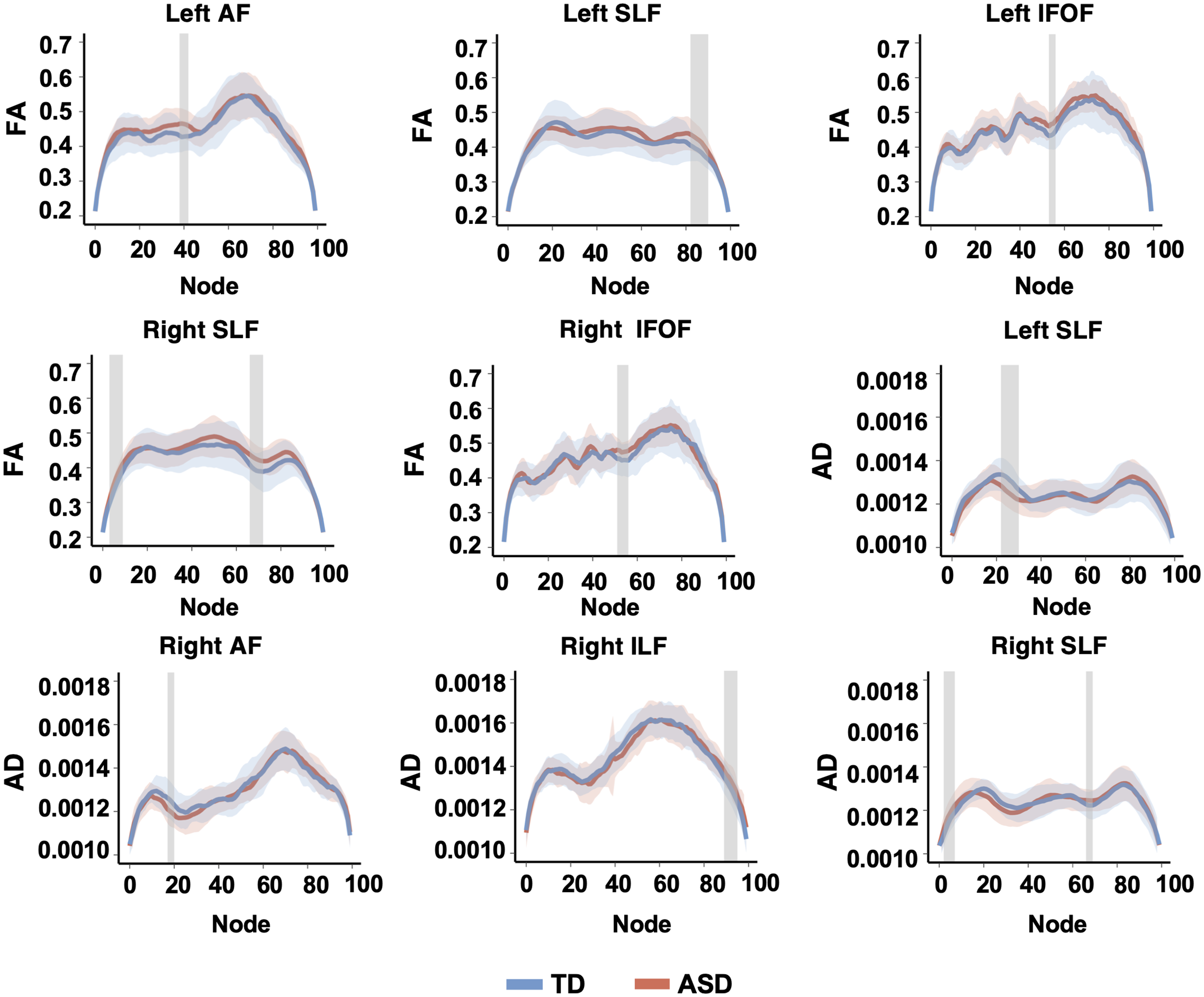 Figure 3. Curve plots depict group differences in white matter fiber tracts at the point-wise level for each DTI metric between TD and ASD children. Solid lines represent mean values, and shaded regions represent standard deviations at each node for each group. Grey bars mark fiber node locations with significant differences, defined as segments with more than three consecutive nodes at p < 0.05 after permutation-based corrections. No additional correction for multiple comparisons was applied. AF, arcuate fasciculus; SLF, superior longitudinal fasciculus; IFOF, inferior fronto-occipital fasciculus; ILF, inferior longitudinal fasciculus; FA, fractional anisotropy; AD, axial diffusivity.