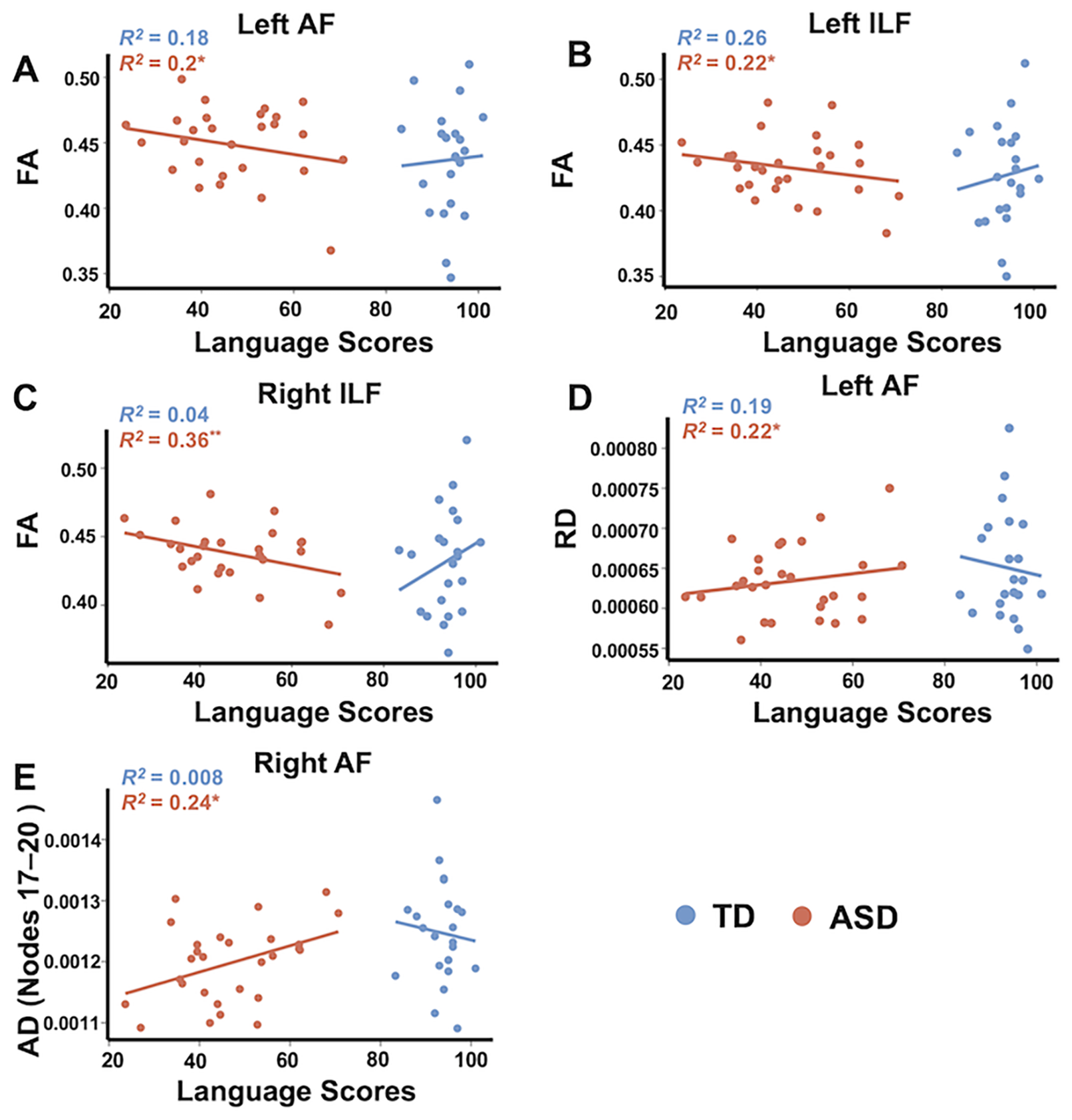 Figure 4. Scatterplots displaying significant associations between mean DTI metrics and language scores in the ASD group in FA of the left AF (A), FA of the left ILF (B), FA of the right ILF (C), RD of the left AF (D). There were also significant associations between mean DTI metrics across nodes 17–20 and language scores in the ASD group (E). The asterisk indicates significant correction after permutation correction. *p < 0.05. The R2 values were calculated from partial correlation analysis, controlling for age and sex. ILF, inferior longitudinal fasciculus; AF, arcuate fasciculus; FA, fractional anisotropy; RD, radial diffusivity; AD, axial diffusivity.