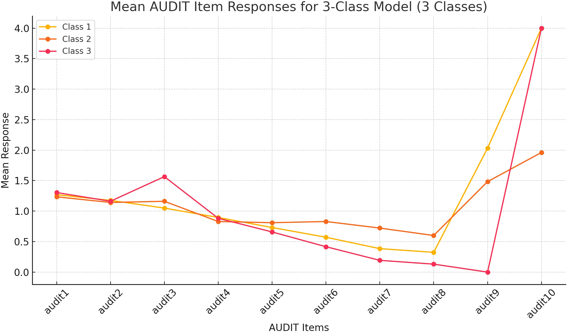 Mean AUDIT Item Responses for 3-Class Model in the Main Sample (n=693). This figure shows the mean response patterns for AUDIT items across three latent classes identified in the analysis of all participants (n=693) who used alcohol in the last 3 months. Each class represents a distinct subgroup of participants, with Class 1, Class 2, and Class 3 displaying unique response trends across the 10 AUDIT items. Class 1= recreational drinkers, Class 2= problem drinkers, Class 3= hidden problem drinkers.