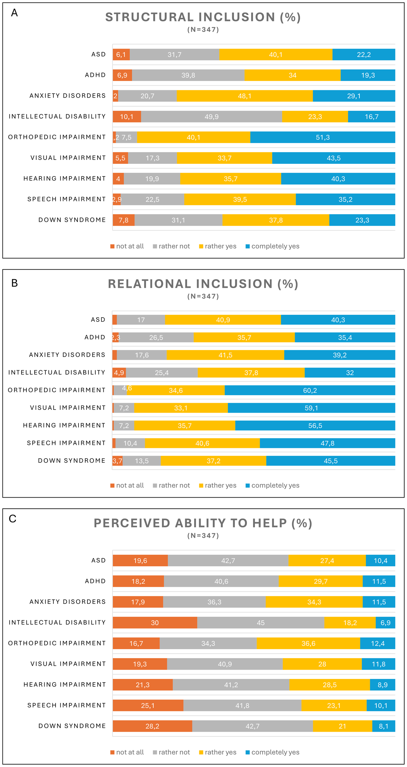 Parents were the least willing to include children in the same class with intellectual disability, where overall only 40% of parents reported a positive approach. ADHD, Down syndrome, and ASD were among the least supported disabilities, with reported positive attitudes ranging from 53.3% to 62.3% (Figure 2A). Parents agreed to include children with orthopedic impairment in the class the most, with a cumulative 91.4%, combining “rather yes” and “completely yes” answers. Anxiety disorders were also met with a positive attitude (77.2%), while visual impairment (77.2%), hearing impairment (76%), and speech impairment (74.7%) were also given positive attitudes regarding structural inclusion.