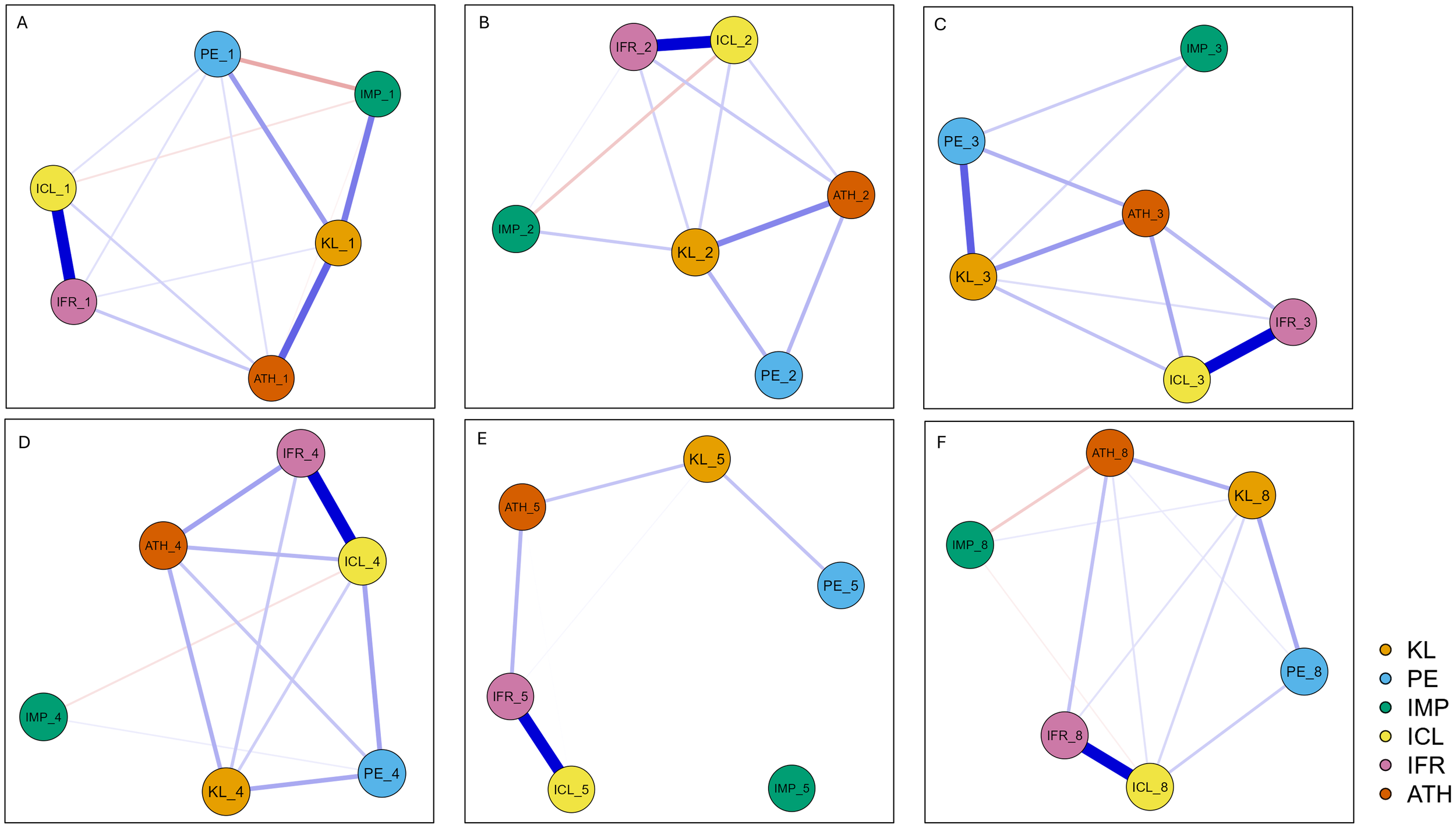 In the intellectual disability network (Figure 3D), with 11 of 15 non-zero edges, ICL–IFR was somewhat weaker (0.449), but PE–ICL was salient (0.162) and KL–PE present (0.152). KL–ATH edge was weaker (0.139). IMP–ICL showed a mild negative edge (−0.051). Centrality clearly favoured ICL (1.323).