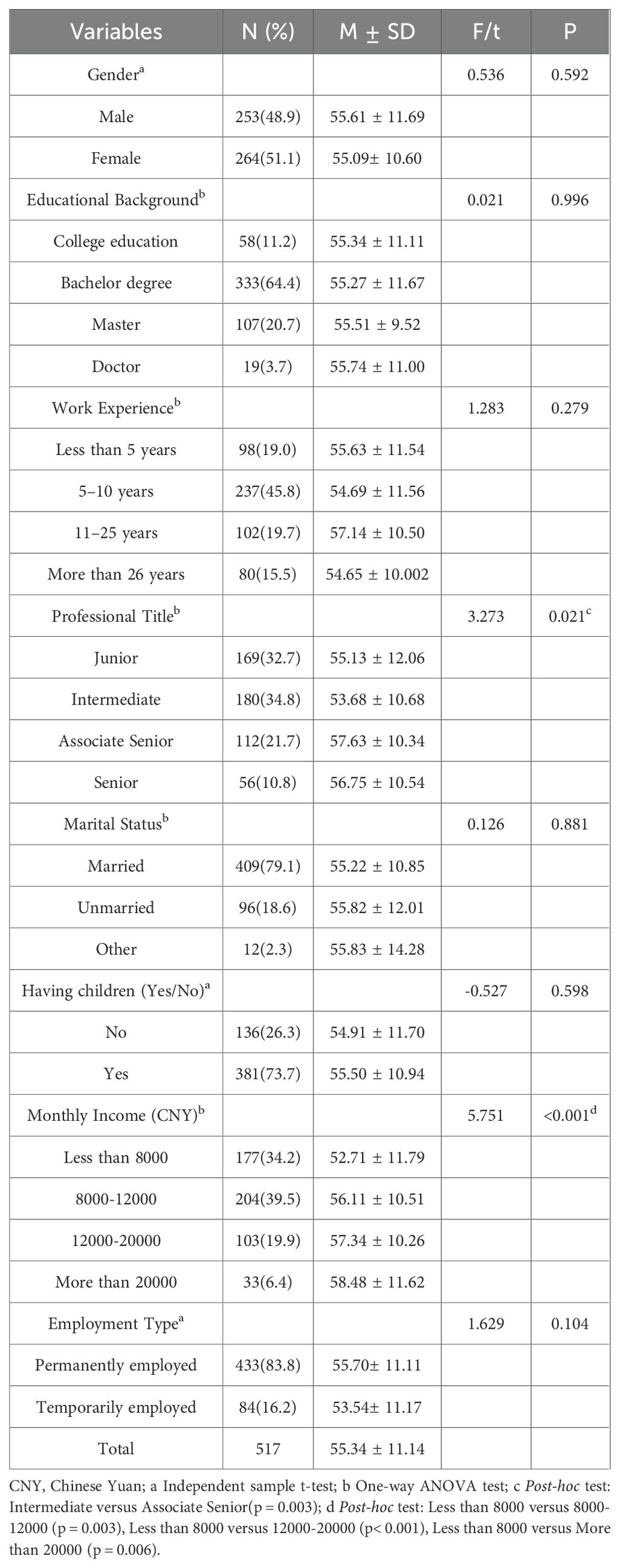 A total of 517 psychiatrists participated in this study. The mean age was 38.12 ± 8.69 years. Among them, 253 participants (48.9%) were male and 264 (51.1%) were female. A total of 237 participants (45.8%) reported 5 to 10 years of work experience. Most respondents held intermediate professional titles (180, 34.8%), followed by junior titles (169, 32.7%). The majority were married (409, 79.1%), and 381 (73.7%) had children. Monthly income most frequently ranged from 8,000 to 12,000 CNY (204, 39.5%). Additionally, 433 psychiatrists (83.8%) were permanent staff members. See Table 1.