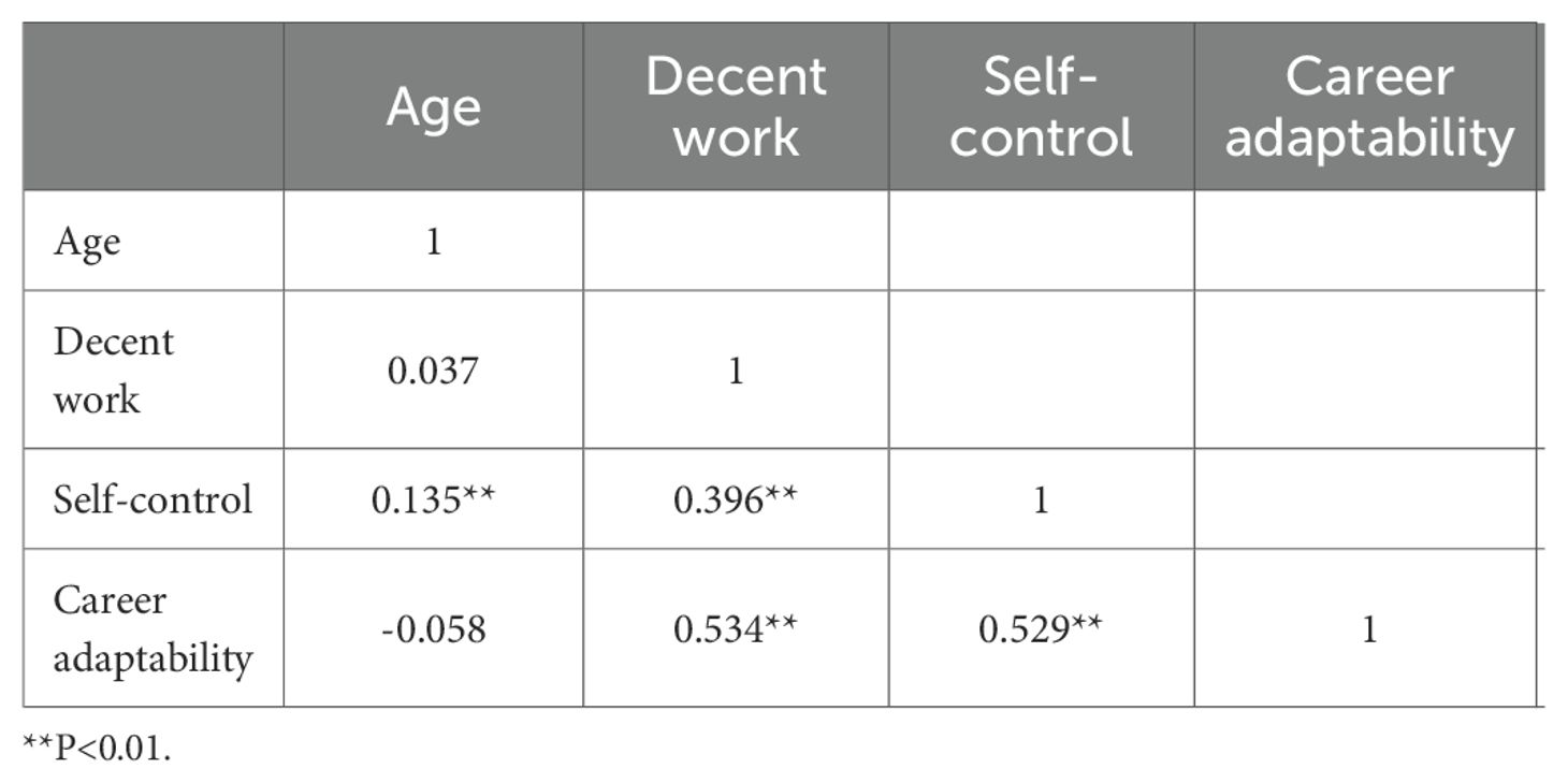 Pearson correlation analysis revealed significant positive correlations among the core study variables. Career adaptability was positively associated with decent work perception (r = 0.534, p < 0.01), and self-control also showed a positive association with decent work perception (r = 0.396, p < 0.01). In addition, self-control demonstrated a significant positive correlation with career adaptability (r = 0.529, p < 0.01). See Table 2.