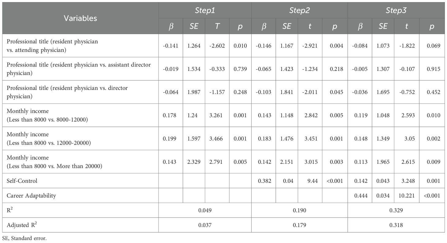 In the third step, career adaptability was entered into the model. Career adaptability showed a significant positive association with decent work (β = 0.444, p < 0.001). Self-control also remained significantly associated with decent work (β = 0.142, p = 0.001). After career adaptability was added, the effect of professional title further weakened, and the difference between resident physician and attending physician was no longer statistically significant (β = -0.084, p = 0.069). The R² value increased to 0.329, indicating that the final model accounted for 32.9% of the variance in decent work perceptions.