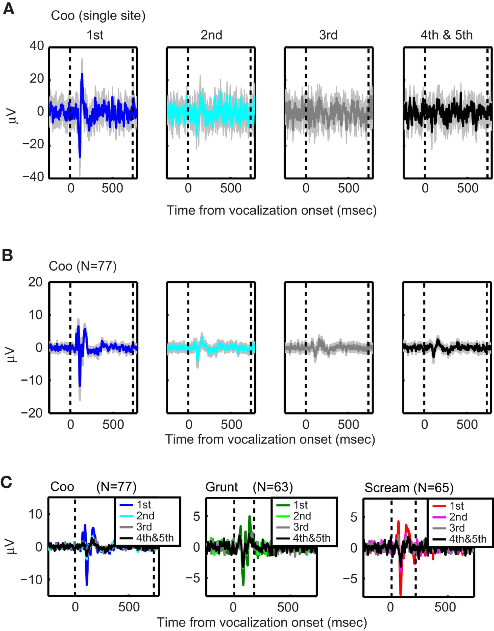 The stimulus-evoked LFP decreased with repeated presentations of a stimulus. The data in (A) show an example from a single site (1st–3rd: n = 25 trials, 4th and 5th: n = 22 trials); whereas those in (B,C) show population-level stimulus-evoked LFP. In (A,B), the data illustrate the effect that repeated presentations of the coo vocalization had on the LFP. The data in the first column illustrate the LFPs from the first vocalization presentation. The data in the rightmost column illustrates the LFPs from the fourth and fifth vocalization presentations; the data from fourth and fifth presentations were combined. The gray error bars are bootstrapped 95% confidence intervals of mean. The data in (C) illustrate how the stimulus-evoked LFP decreased as a function of stimulus presentation. The data in each column were generated with a different vocalization: coo (left; n = 77 sites), grunt (middle; n = 63 sites), and scream (right; n = 65 sites). Within each plot, the stimulus-evoked LFP are plotted as a function of stimulus presentation. All of the data are aligned relative to vocalization onset (i.e., the vertical dotted line at time t = 0). The second dotted line indicates vocalization offset.