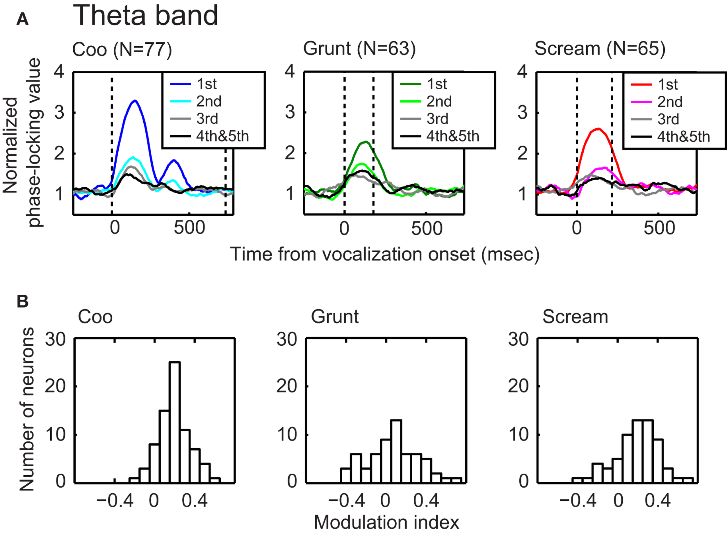The phase-locking value of the theta band (4–10 Hz) decreased with repeated presentations of a vocalization. The data in each column of (A) illustrate the effect that repeated presentations of a vocalization had on phase-locking. The data in each column were generated from a different vocalization: coo (left; n = 77 sites), grunt (middle; n = 63 sites), and scream (right; n = 65 sites). Within a plot, the phase-locking values versus time profiles are plotted as a function of stimulus presentation. Data are aligned relative to vocalization onset (i.e., the vertical dotted line at time t = 0). The second dotted line indicates vocalization offset. The data in (B) show the distributions of modulation-index values as a function of vocalization: coo (left; n = 77 sites), grunt (middle; n = 63 sites), and scream (right; n = 65 sites). The mean value of each distribution is reliably (t-test; p < 0.05) greater than zero, indicating that, for each vocalization, the phase-locking of the theta band reliably decreased with stimulus presentation.