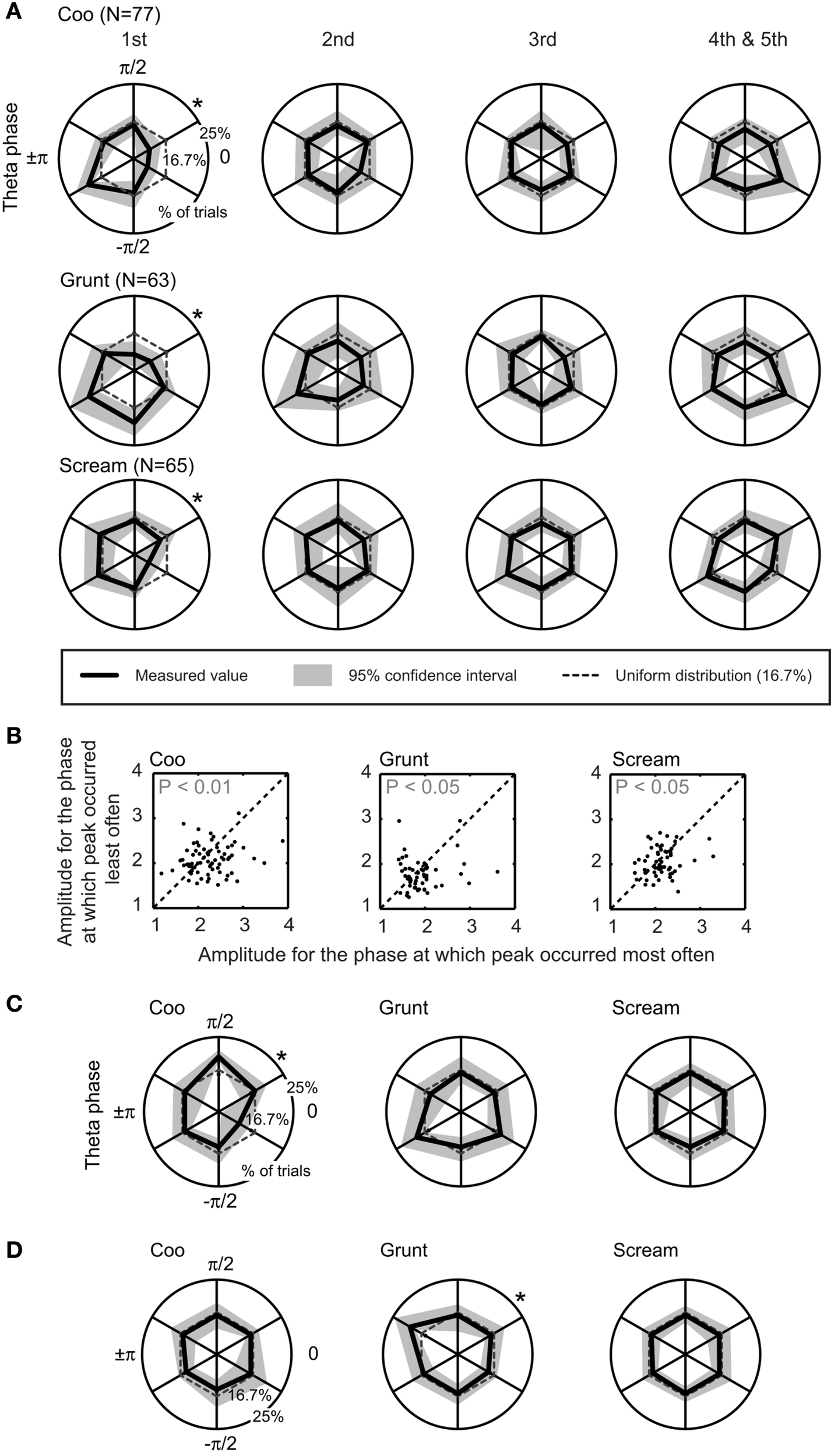 To test these hypotheses, we analyzed the cross-frequency coupling between frequency bands of the total LFP. Figure 6A shows the relationship between the peak amplitude of gamma band and the phase of the theta band at the population level. During the first-stimulus presentation, the distribution of theta-band phase was not uniform: the peak amplitude of the gamma band occurred at specific phases of the theta band (Figure 6A, permutation test; coo: p < 0.05; grunt: p < 0.05; scream: p < 0.05). However, with further stimulus presentations, the peak amplitude of the gamma band did not occur at specific theta-band phases. Instead, it was uniformly distributed across all phase values (permutation test, p > 0.05). Reliable coupling was also identified between the peak amplitude of the gamma band and other frequency bands during the first-stimulus presentation. However, this coupling was only present in a subset of the vocalizations (i.e., in the alpha band for the coo, Figure 6C; and in the beta band for the grunt, Figure 6D) and not all three vocalizations like that observed between the gamma and theta bands.