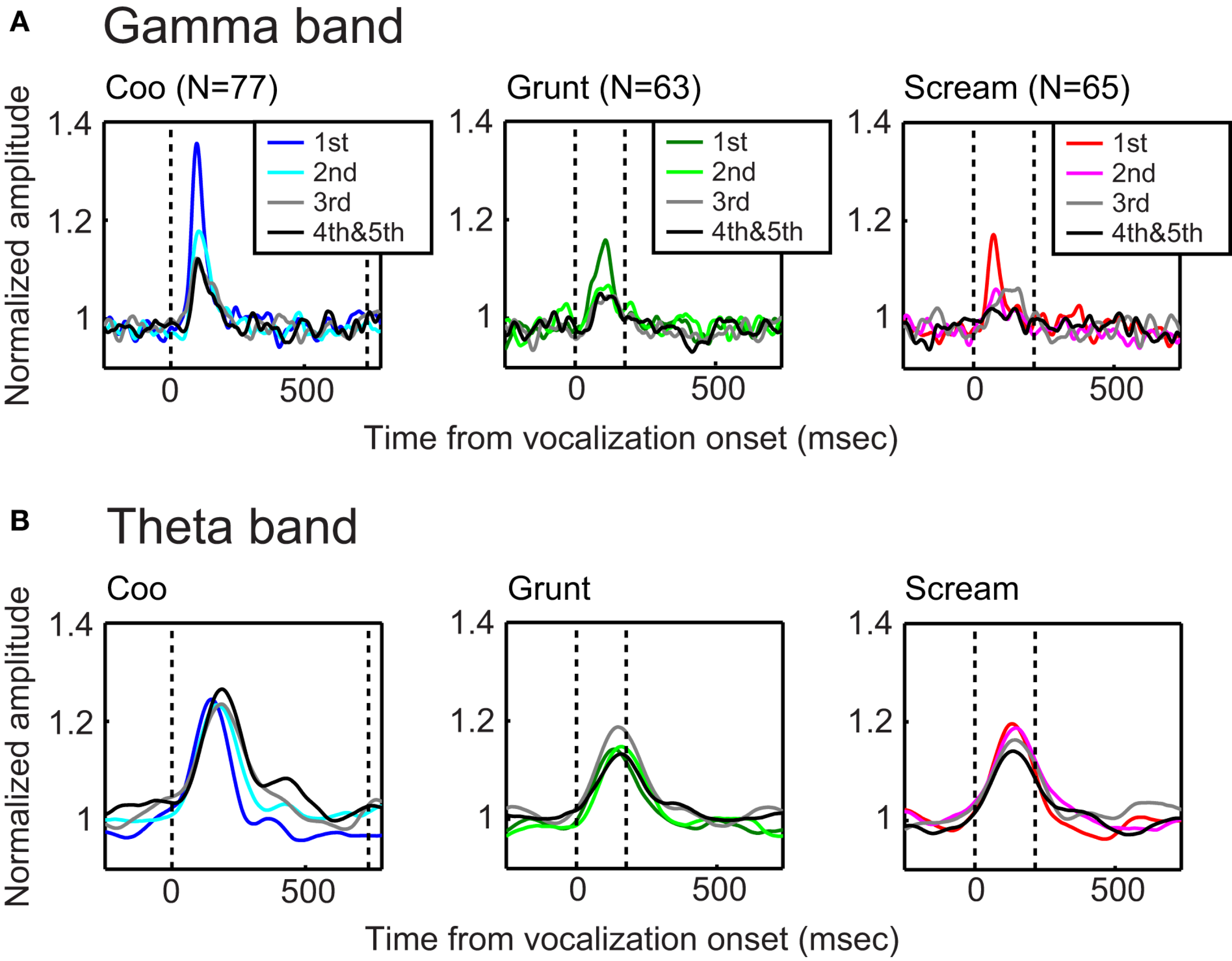 Figures 3A,B illustrates the relationship between total-LFP power, vocalization, and the number of vocalization presentations. As can be seen, independent of the number of stimulus presentations, the coo modulated the total-LFP power across a broad range of frequencies (4–50 Hz; Figure 3A). These frequencies spanned the theta, alpha, beta, and gamma bands. LFP power across these frequencies, on average, decreased with sequential presentations of the coo vocalization (Figure 3A). Similar reductions in LFP power were identified for repeated presentations of the grunt and the scream vocalizations (Figure 3B). The time–amplitude profile of the gamma band is shown in Figure 4A. As expected from the data shown in Figure 3, the gamma-band amplitude decreased with stimulus presentation. These time–amplitude profiles also indicate that the greatest decrease in amplitude was between the first and second stimulus presentations.