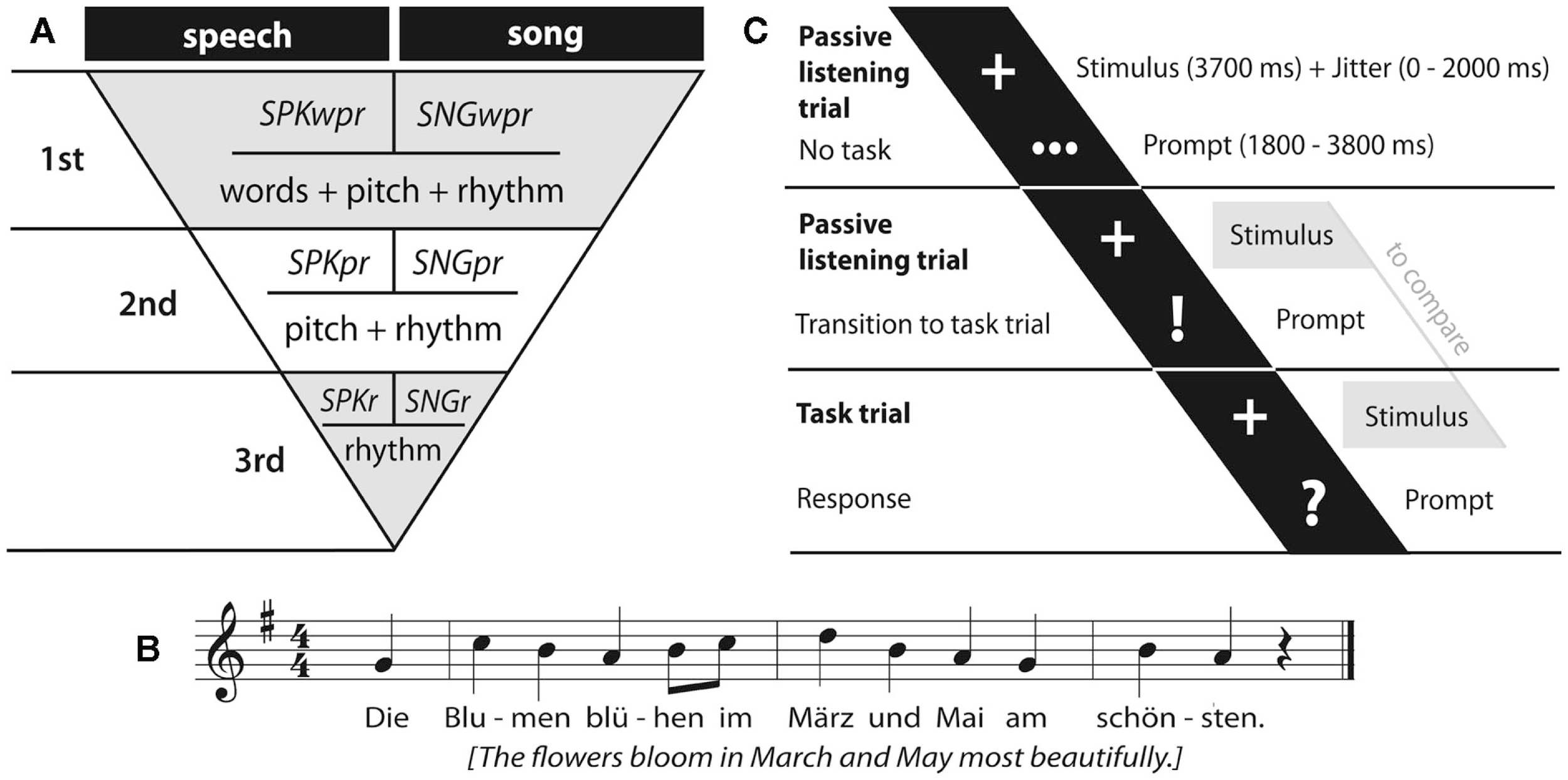 (A) Experimental design. Six conditions in a subtractive hierarchy on three levels: first level: SPKwpr and SNGwpr (containing words, pitch pattern, and rhythm), second level: SPKpr and SNGpr (containing pitch pattern and rhythm), third level: SPKr and SNGr (containing rhythm). (B) Stimulus example. (C) Timeline of passive listening trial and task trial.