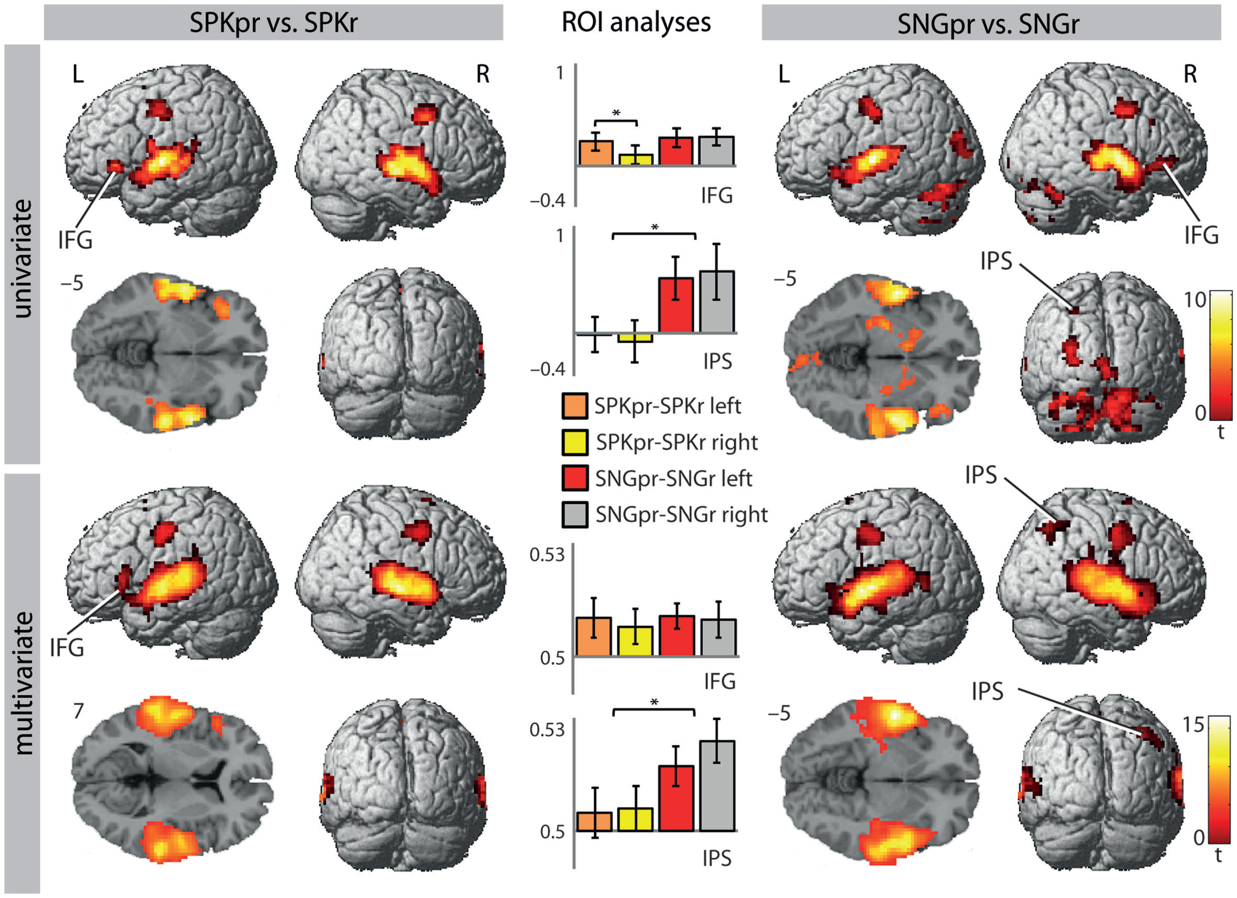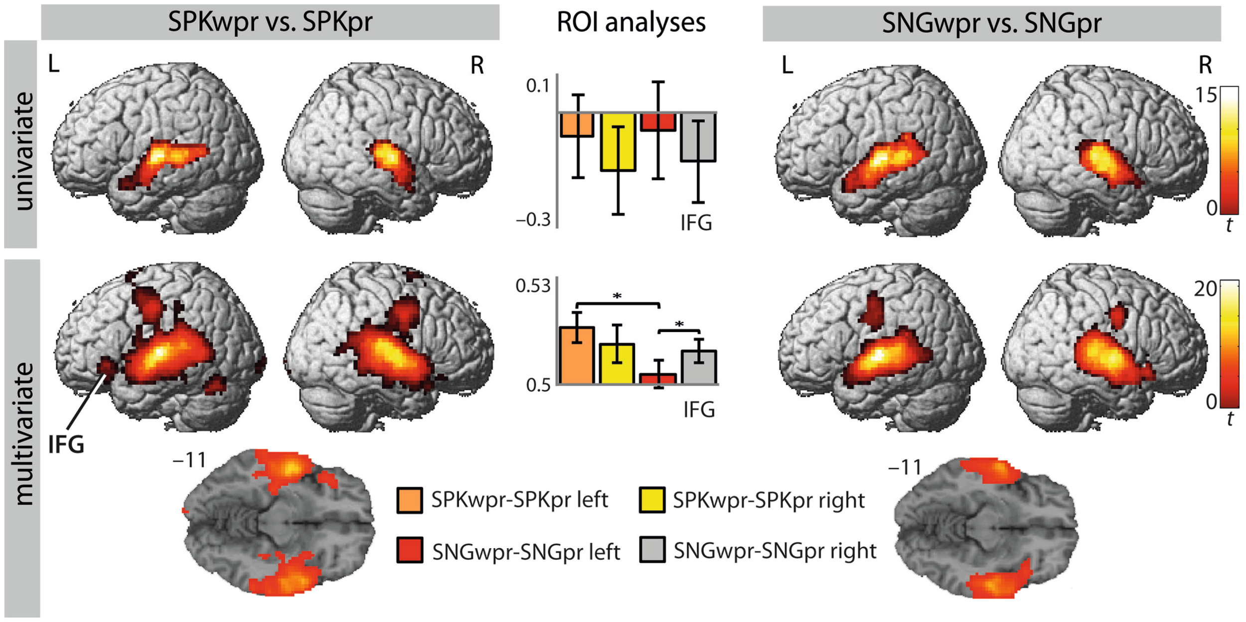 The overlap of these activations was nearly complete as evidenced by a conjunction analysis and no significant differences in the direct comparison of both contrasts, i.e. [(SPKwpr–SPKpr)–(SNGwpr–SNGpr)] and [(SNGwpr–SNGpr)–(SPKwpr–SPKpr)].