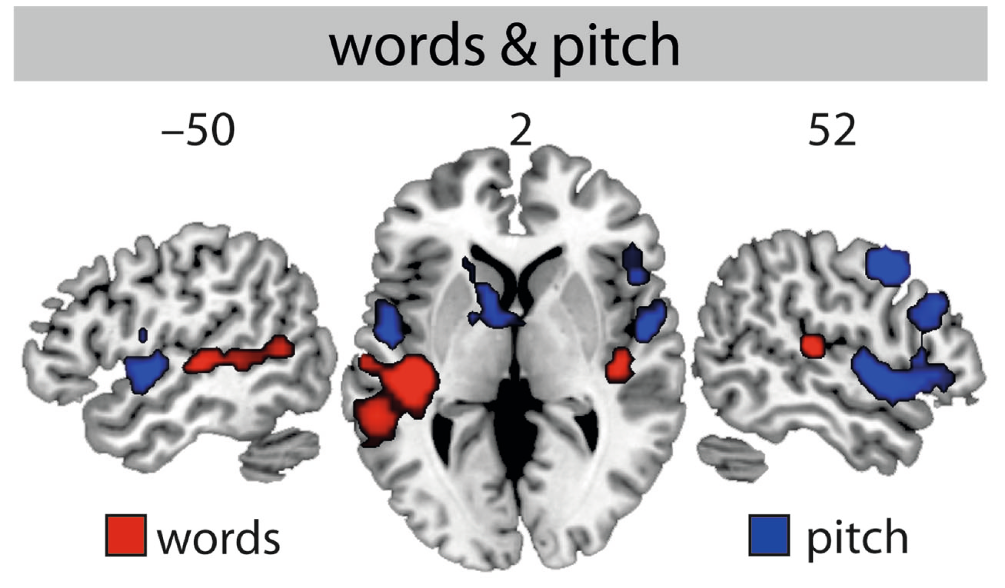 We hypothesized first that words (or text and lyrics) in both song and speech may recruit left frontal and temporal regions where lexical semantics and syntax are processed (for a review, see Bookheimer, 2002; Friederici, 2002, 2011). Second, the neural activation of prosody in speech and melody in song may be driven by its acoustic, pitch-related properties that are known to evoke a relative predominance of right hemispheric involvement (Zatorre, 2001; Jamison et al., 2006; Obleser et al., 2008). Furthermore, we expected differences with respect to gliding and discrete pitches to be reflected in particular brain signatures.