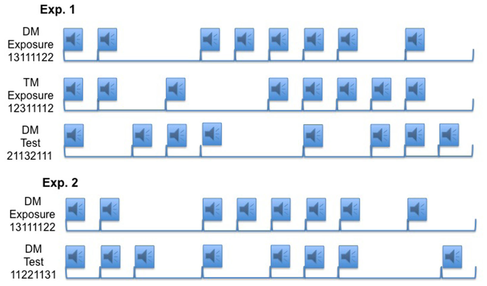The temporal patterns were selected from the metrically structured patterns of Povel and Essens (1985). In the following notation, two and three refer to intervals of duple and triple multiples of the basic temporal unit 1, which was 700 ms in this experiment. The exposure interval patterns were 13111122 (DM) and 12311112 (TM), and the test interval pattern was 21132111 (DM). All patterns consisted of five instances of the 1-interval, two instances of the 2-interval, and one instance of the 3-interval (Figure 1). Unlike the original Povel and Essens (1985) patterns, we removed the final long interval (4) from the temporal patterns. The long interval was omitted to prevent obvious segmentation of the pattern (with a starting point after the long interval). But without the consistent long interval at the end of the pattern, participants could potentially perceive the starting point of the sequence at different points or with groupings different from the original Povel and Essens (1985) patterns.