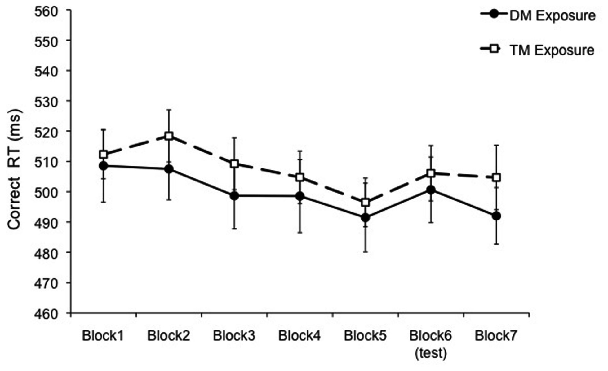 An ANOVA with Block (seven levels) as a within-subject factor and Exposure (DM or TM exposure patterns) as a between-subjects factor was run on the correct RT data (Figure 2). The main effect of Block was significant, F(6, 270) = 4.26, p = 0.001, MSE = 473.94 [Greenhouse–Geisser correction, F(4.71, 212.09), p = 0.001], but there was no main effect of Exposure and no interaction, ps > 0.55. RT decreased significantly from Block 1 to Block 5, F(1, 45) = 8.74, p = 0.005, and increased from Block 5 to Block 6, with the introduction of the test block, F(1, 45) = 4.28, p = 0.04. The re-introduction of the exposure sequence decreased RT, but not significantly, p = 0.19. This lack of recovery in the final block has been observed in previous SRT studies, leading some researchers to implement multiple exposure pattern blocks after the test block to enable recovery of RT speed (Buchner and Steffens, 2001; Destrebecqz and Cleeremans, 2001; Shin and Ivry, 2002; O’Reilly et al., 2008). Due to our long temporal patterns and the overall length of our experiment, we did not add an additional block of the exposure pattern at the end.