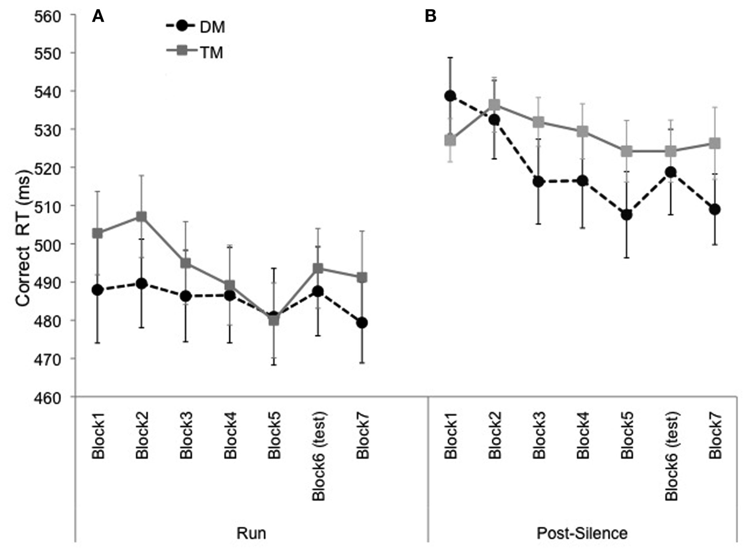 Regarding the introduction of the test sequence in Block 6 there are some indications of learning, but separating run and post-silence events around the test block also led to decreased statistical power in each condition. For both DM and TM groups indications of learning can be observed for the run events with RT slowing down in Block 6, even if this RT change failed to reach significance, F(1, 45) = 2.89, p = 0.096. For the post-silence events, only the DM exposure group demonstrated slower RT for Block 6 in comparison to the surrounding exposure blocks, even if this learning score fell short of significance, F(1, 45) = 3.17, p = 0.08. For the post-silence events, the RT of the TM exposure group was rather slow overall and remained stable over all the blocks.