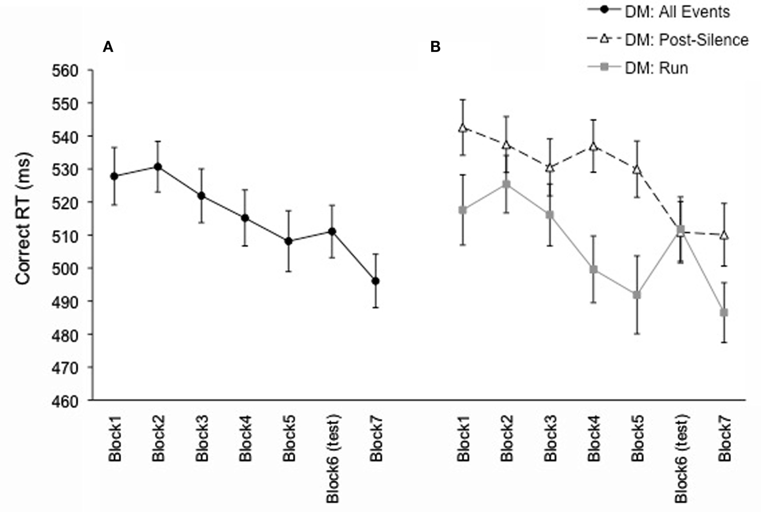 Mean correct RT for Experiment 1 presented as a function of block separated by event-type (run vs. post-silence). (A) Are the run events and (B) are the post-silence events. Error bars represent the standard error of the mean.