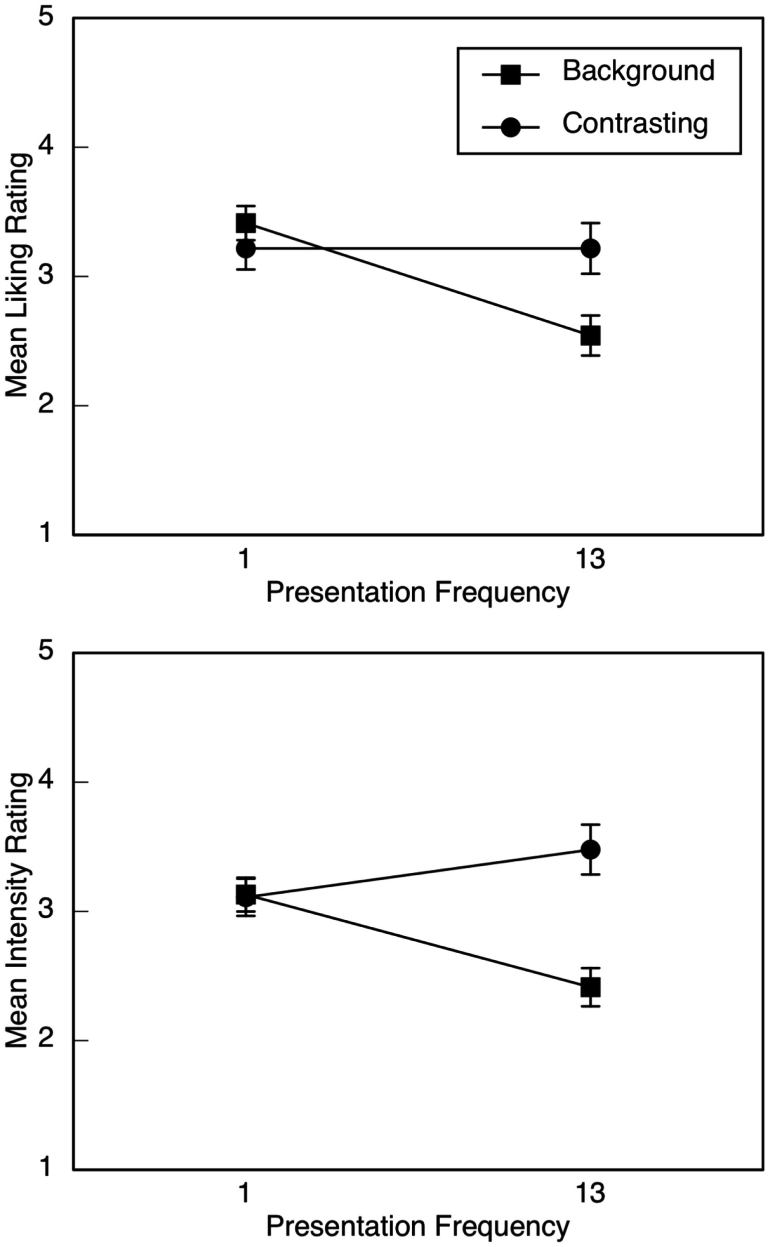 In both experiments, we predicted that emotional responding (i.e., liking and intensity) to the background excerpts would decrease as the number of presentations increased, whereas responding to the contrasting excerpts would be stable or increase. In other words, we predicted an interaction between emotion type (background or contrasting) and presentation frequency. For both experiments, we predicted that intensity and liking ratings would be positively correlated. Because liking is considered to be a consequence of increases in emotional intensity, we also expected that increases in liking due to emotional contrast would disappear when intensity ratings were held constant.