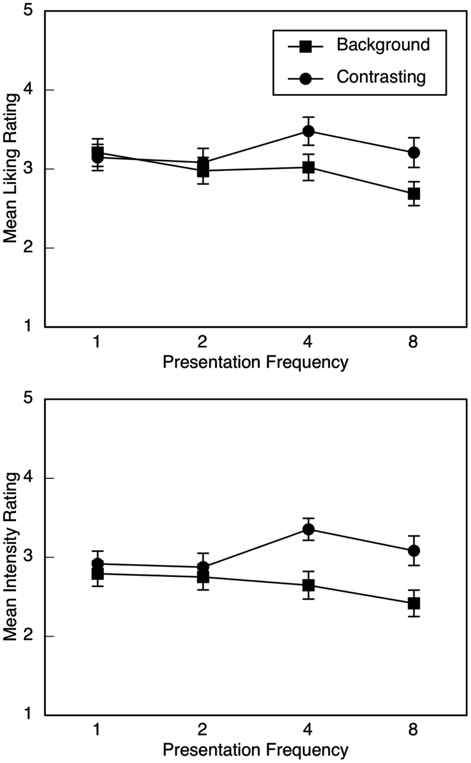 Mean liking (upper panel) and emotion-intensity (lower panel) ratings in Experiment 2, illustrated as a function of emotion type (background or contrasting) and presentation frequency of the background emotion (1, 2, 4, or 8). Error bars are SE.