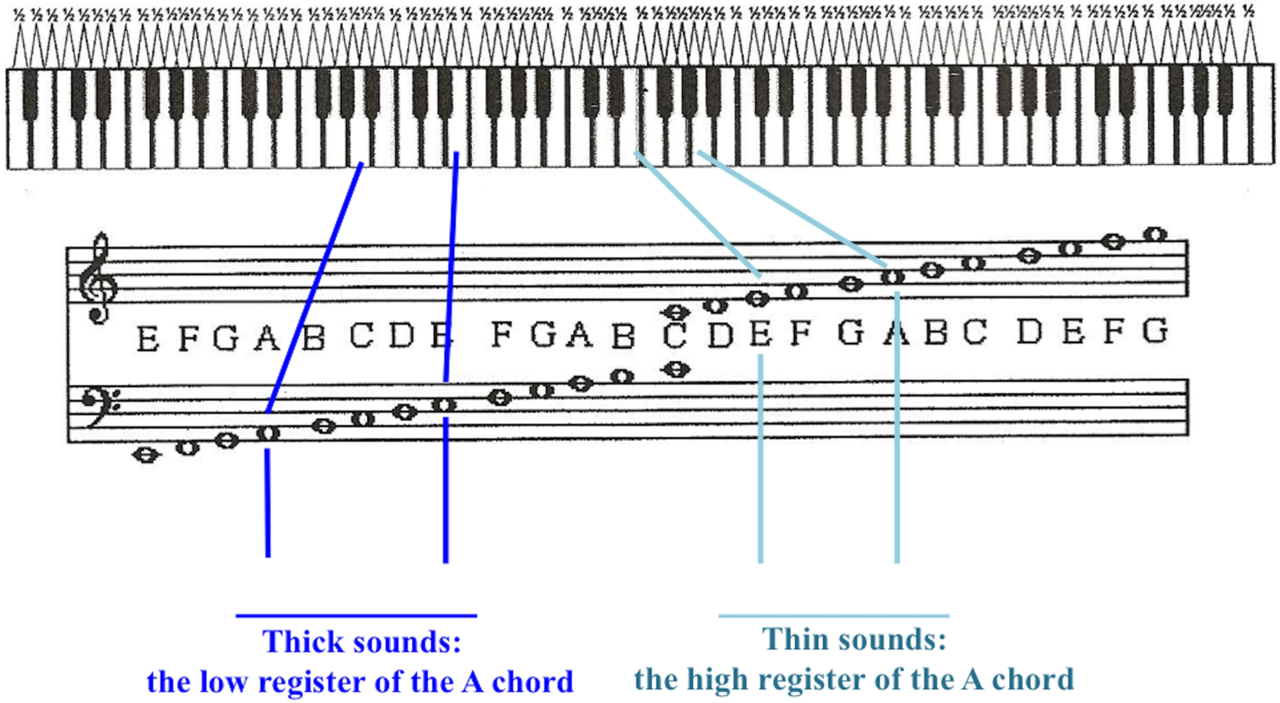 Musical notation and octaves on piano of notes played on the guitar in MSTT. Blue lines indicate notes in “thick sound;” teal lines indicate “thin sound.”