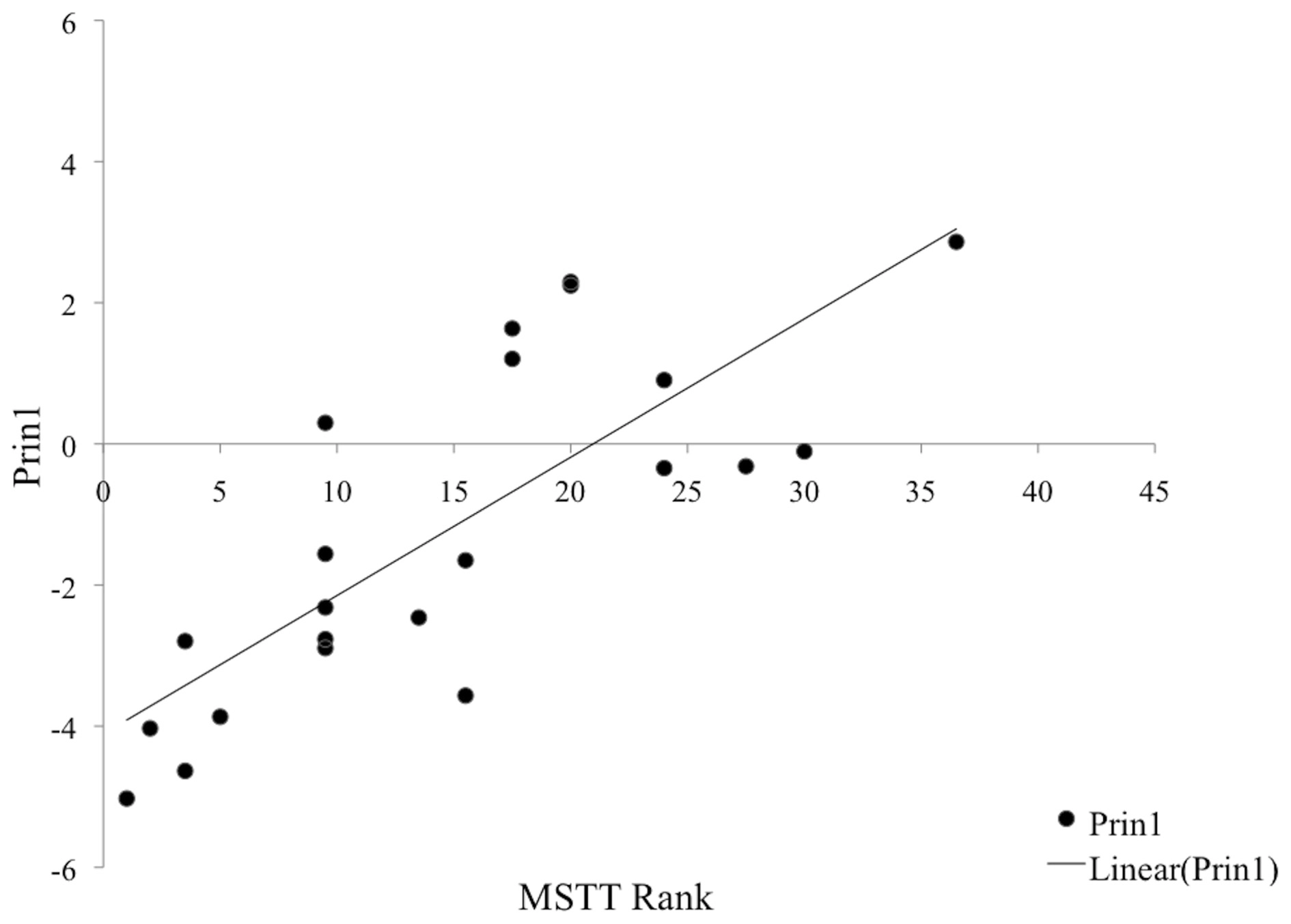 We observed that the first variable computed by our PCA accounted for 33% of the C&S performance variation and that only five further variables were needed to account for more than 70% of the C&S variance. We then examined through CA the relationship of the score on each of these Principle component variables to the score on MSTT. Prin1 was significantly related to the score on MSTT (r = 0.5228, p < 0.0004). None of the other Principle Component variables included showed a significant relationship to MSTT. The relationship between Prin1 and MSTT remains highly significant (p < 0.001) after Bonferroni correction to account for multiple comparisons.