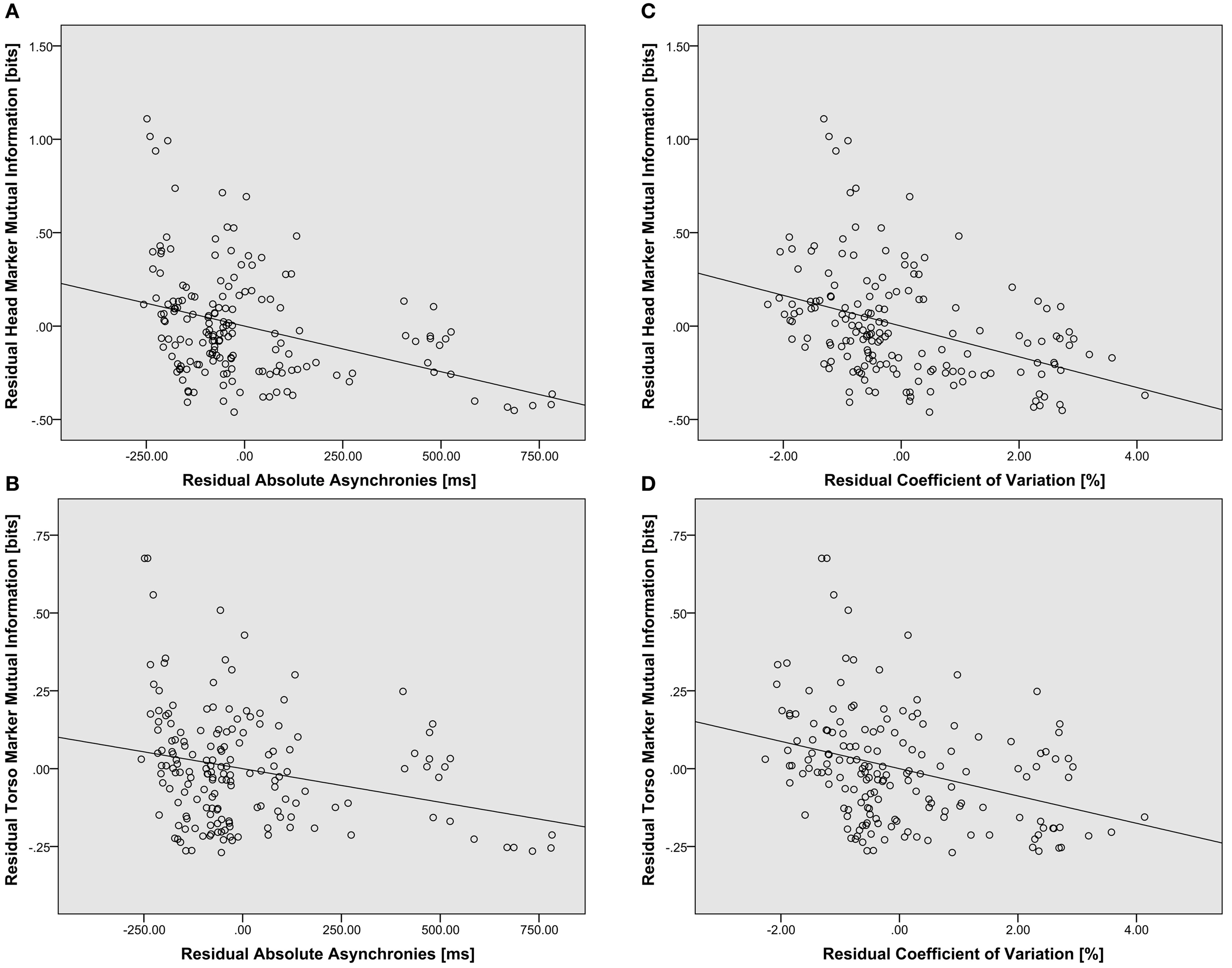 Scatterplots showing partial correlations between measures of keystroke asynchrony (mean absolute asynchronies and coefficient of variation) and body movement coordination (velocity of head and torso markers), controlling for the effects of Familiarity and Take. Each circle represents the residual value for a single duo performance (one pair on one take in one condition). (A) Partial correlation of head marker mutual information (in bits) and mean absolute keystroke asynchronies (in ms). (B) Partial correlation of torso marker mutual information and mean absolute asynchronies. (C) Partial correlation of head marker mutual information and the coefficient of variation in keystroke asynchronies (in %). (D) Partial correlation of torso marker mutual information and the coefficient of variation.