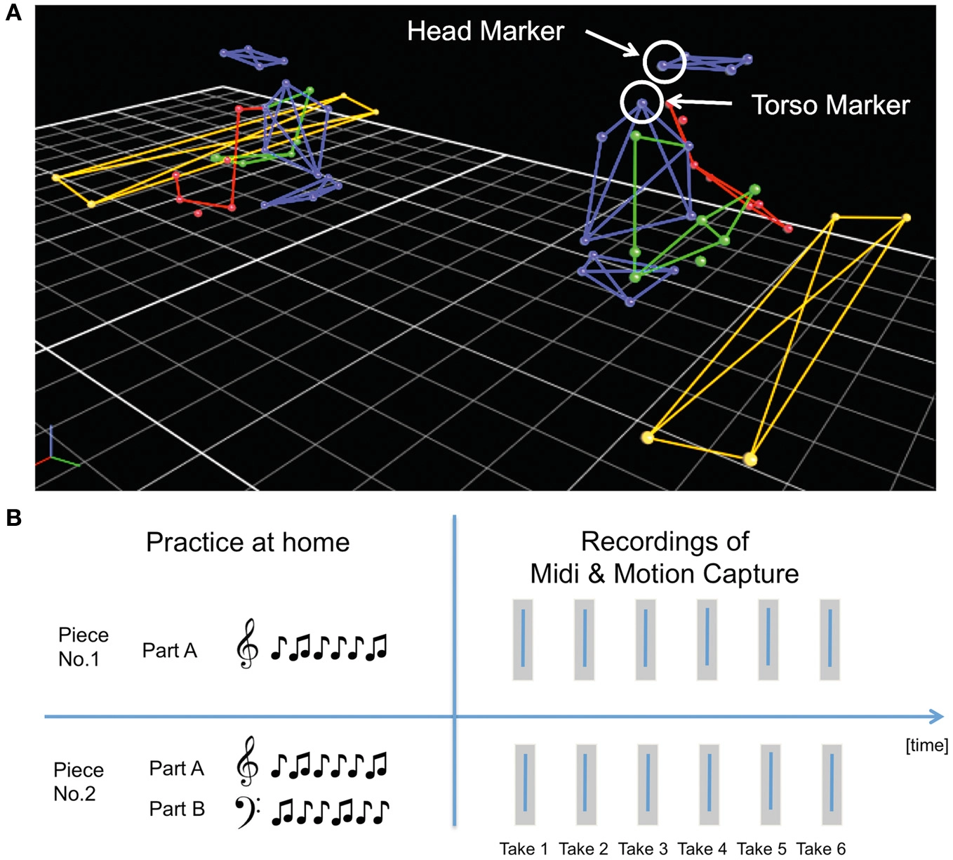 (A) Motion capture model representing the laboratory set up of pianos and placement of reflective motion capture markers on pianists' upper bodies. (B) Experimental design divided into two parts—practice at home and recordings of MIDI (keystroke) and motion capture data in the lab.