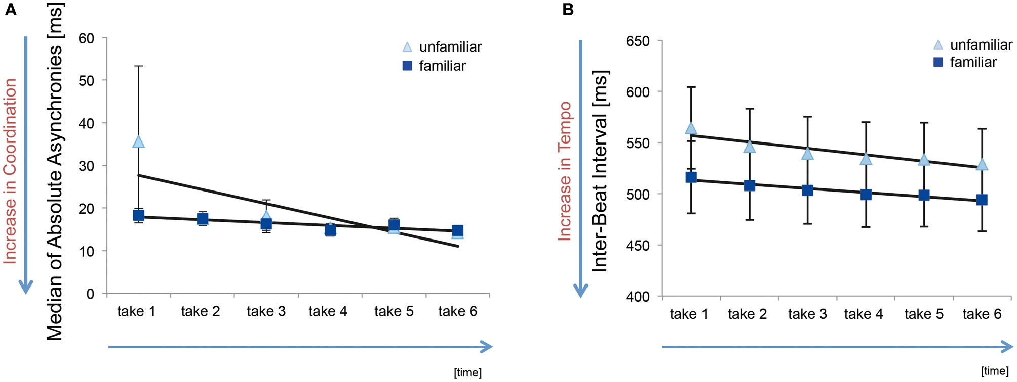 (A) Median of absolute keystroke asynchronies (in ms) across six takes in the familiar and unfamiliar condition. The light blue triangles represent the condition in which the co-performer's part was unfamiliar; the dark blue squares depict the condition in which both parts were known to both pianists. The black line shows a fitted linear trendline and the error bars show the standard error. (B) Inter-beat interval showing the effects of tempo.
