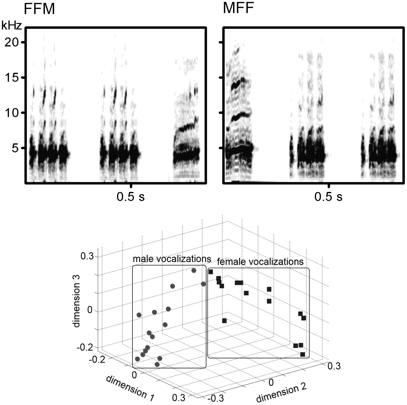 (Upper panel) Examples of the spectrogram of the sound stimuli. Left; Two calls from a female and a call from a male. Right; Two calls from another female and a call from another male. (lower panel). Scatter plots showing the similarity of the acoustic spectral patterns of male calls and female calls.