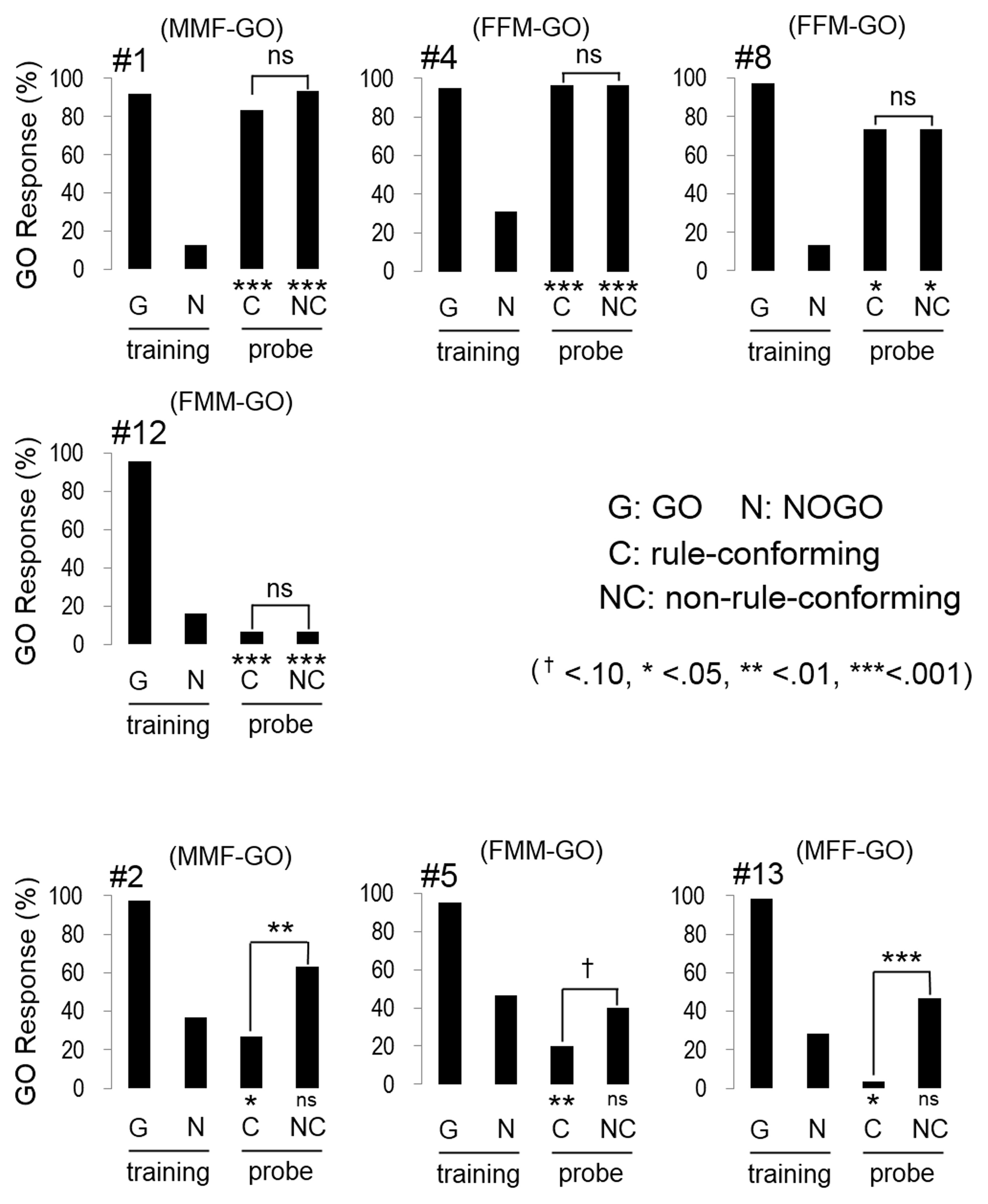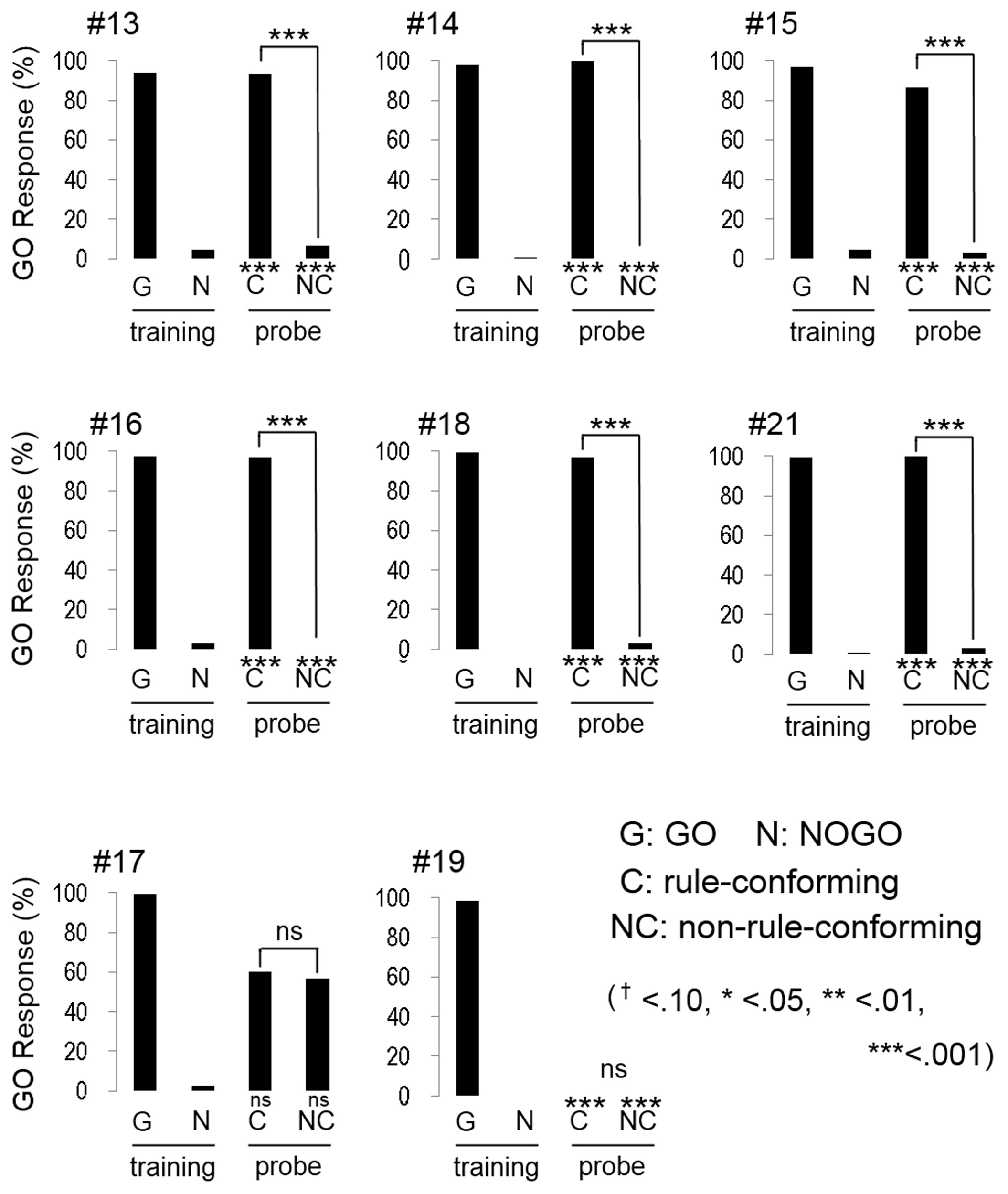 In the transfer test, the number of GO responses by all subjects was greater for the rule-conforming probe stimuli than the non-rule-conforming probe stimuli. Analysis of the pooled data revealed a significant difference in the rate of GO response between those probe types (p < 0.001, paired Wilcoxon test) and large d′ (1.31 ± 0.12, mean ± S.E.), although the value was larger for the baseline (2.55 ± 0.99). However, in the rule-generalization test, the subjects exhibited a variety of response patterns (Figure 2). As a result, the number of GO responses did not differ between rule-conforming and non-rule-conforming stimuli (mean, rule-conforming 14.6, non-rule-conforming 18.6; p = 0.10) and d′ was small (−0.39 ± 0.12) for the pooled data while the value for the baseline was 2.46 ± 0.09. The response patterns were easily categorized into 3 types. Type-1, “Go for everything except NOGO stimuli,” was observed in three birds. Responses were significantly biased toward the GO direction for both rule-conforming and non-rule-conforming probe stimuli based on a binomial test (bird #1 p < 0.001, p < 0.001; # 4 p < 0.001, p < 0.001; #8 p = 0.010, p = 0.010), and there was no difference in the GO response rate between those two probe types (#1 p = 0.23, #4 p = 1, #8 p = 1, chi-square test). Type-2 was “NOGO for everything except GO stimuli.” The response of bird #12 was significantly biased toward the NOGO direction (p < 0.001, p < 0.001), and there was no difference in the GO response rate between those two probe types (p = 1, chi-square test). Type-3 was displayed by the remaining subjects, who to some extent used “a sequence rule” as the discriminative strategy; however, it was an unexpected response. All of Type-3 birds gave more GO-Responses to non-rule-conforming stimuli than rule-conforming stimuli (#2 p = 0.003, #5 p = 0.09, #13 p = 0.008).