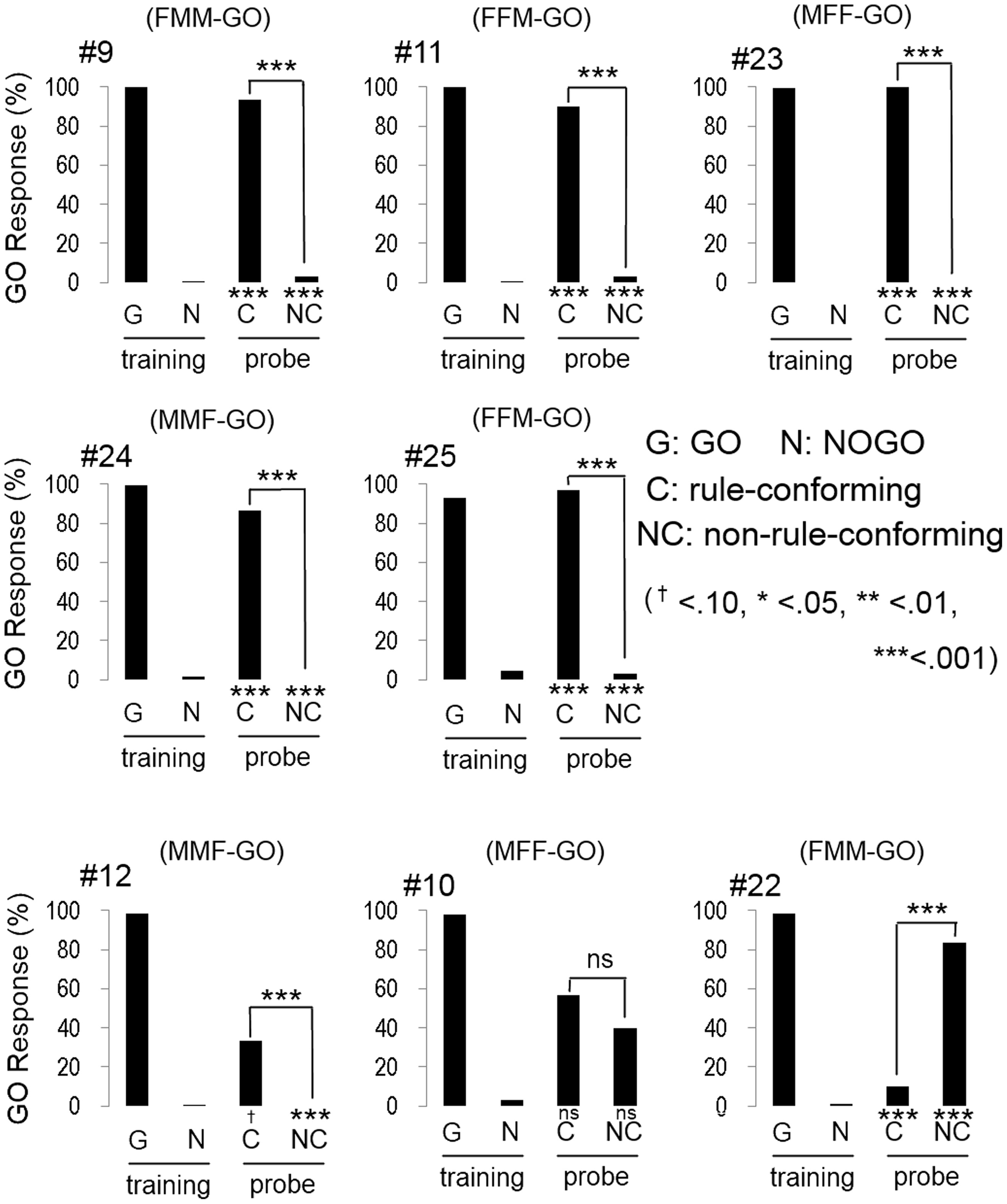 The remaining participants #10, (HV: MFF-GO) and #17 (BV: FMM-GO) responded unsystematically to the probe stimuli (no bias toward either GO nor NOGO; #10 rule-conforming p = 0.36, non-rule-conforming p = 0.58, #17, p = 0.58, p = 0.36, binomial test, and no significant difference between rule-conforming and non-rule-conforming stimuli; #10, p = 0.20, #17, p = 0.79, chi-sq. test). Although the results of those participants were similar, their discriminative strategies were different. Participant #10 reported that both the number of M and F voice and algebraic rules could be used to discriminate during the training trials, so he used both strategies for the probe trials. Participant #17 reported that probe stimuli consisted of unfamiliar sounds, so he responded to those sounds randomly.