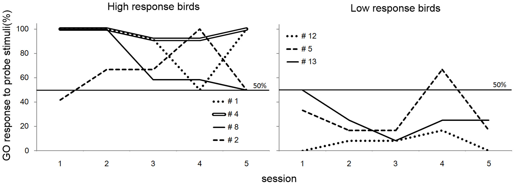 In the present experiment, we presented the bird subjects neither reinforcements nor punishments for responses to the probe stimuli. A training session, which exhibited high percentage (>85%) of correct trials, was inserted between each pair of probe sessions to prevent the birds from learning the consequences of the response to the probe stimuli. However, it might be possible that the birds learned it in the generalization test. If the birds learned the outcome of the responses to the probe stimuli, they would show a particular trend for GO response to the probe stimuli as the sessions went. However, patterns of GO response for the probe stimuli did not show a systematic change as the sessions went (Figure 5), supporting the idea that they did not explicitly learn the consequence to probe stimuli.
