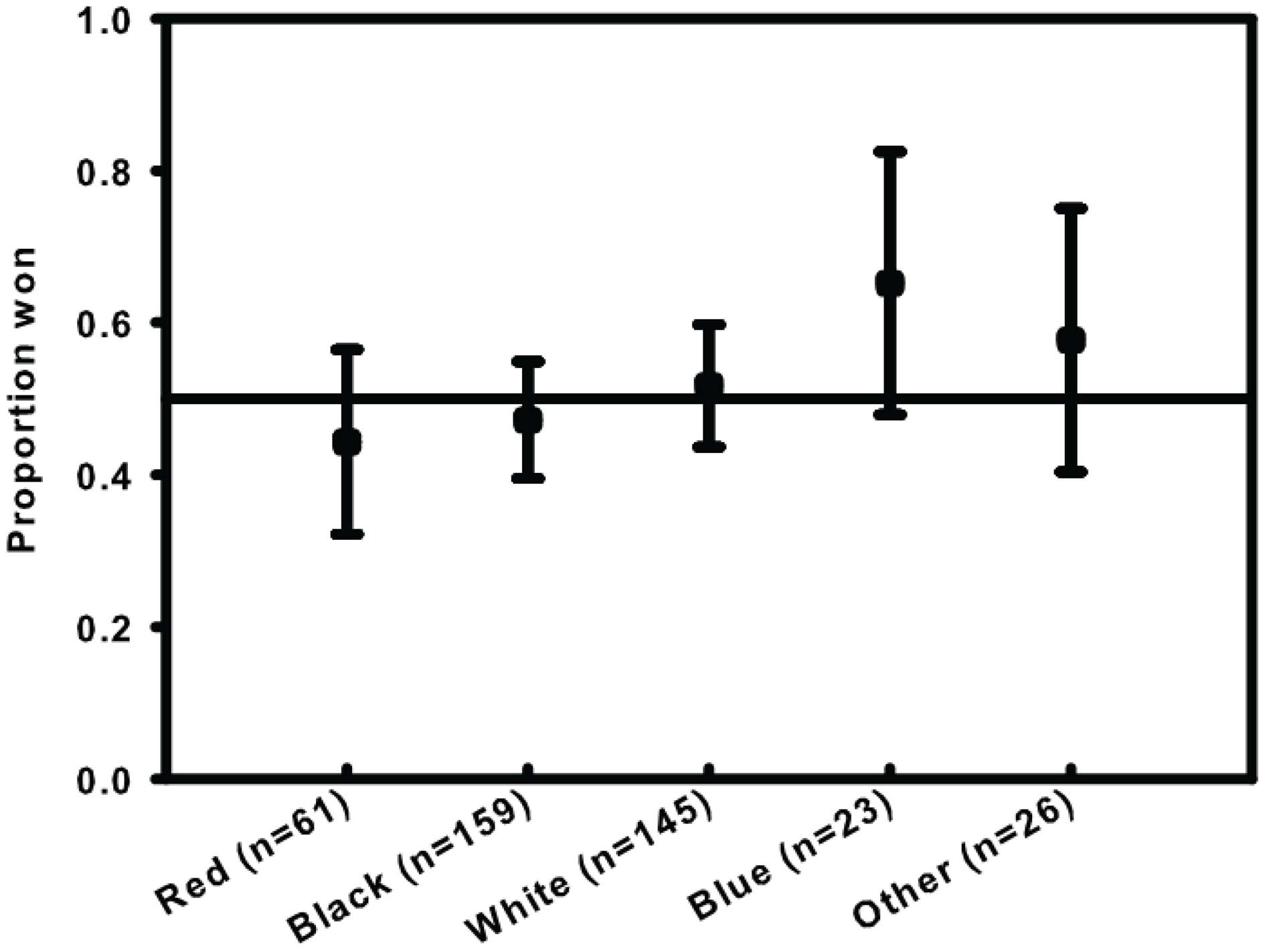Proportion of UFC fights won by color of shorts. Ninety-five percent confidence intervals are based on Agresti–Coull method. Reference line is 0.5.