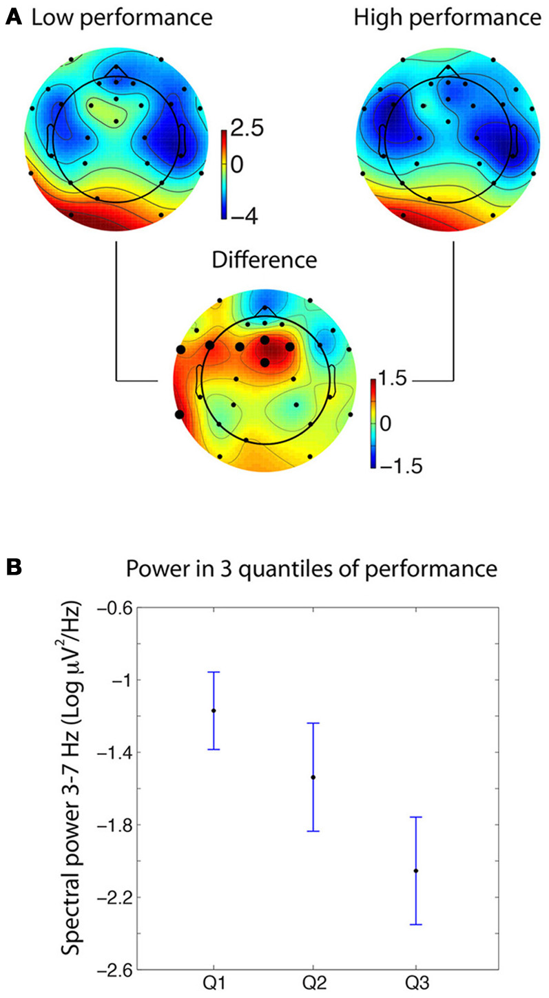 Figure 2. Spectral differences in the theta frequency band for medium M1. (A) Scalp topography of theta power during the mental experiences of information later rated as low (<50%) or high (≥50%) in accuracy [the unit being 10*log10(μV2)]. The large dots on the differential scalp topography indicate significance at p < 0.005. (B) When splitting the data into three quantiles of increasing accuracy (i.e., 0–34; 40–80; and 100% accuracy), theta power for the intermediate accuracy level fell in between the high and low accuracy levels. Error bars indicate 95% confidence intervals.