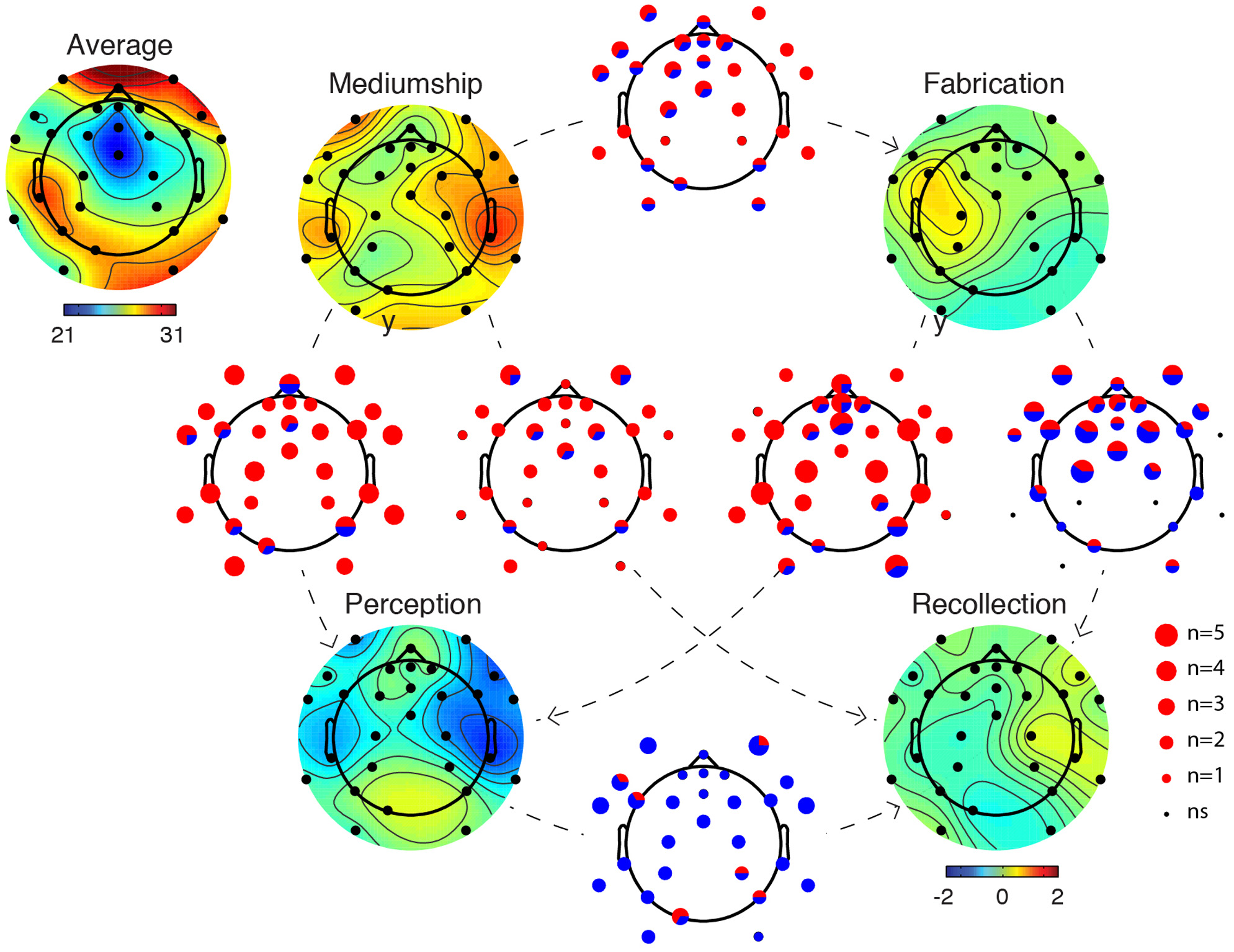 Figure 3. Summary figures depicting differences between mental states in the high gamma frequency band (75–110 Hz). The scalp topography image in the left upper corner indicates the average gamma power for all mental states and all subjects [the unit being 10*log10(μV2)]. Scalp topographies for each mental state indicate deviation from the average scalp power (same units). In between each pair of mental states A and B, a plot indicates the number of significant participants for each electrode (p < 0.01 after cluster correction for multiple comparisons). The size of the dot represents the number of participants for which a given electrode is significant [from n = 0 (ns) to n = 5; significance in all six participants was never attained]. The pie chart within each dot represents the proportion of participants who demonstrated significant differences in one direction (red corresponds to A > B and blue corresponds to A < B). The direction of the comparison is indicated by a directional dashed line from A to B. For example, between the Mediumship Communication mental state and the Perception mental state, most electrodes are significant for three or four participants and the color (red) indicates that gamma power is of larger amplitude during the Communication mental state compared to the Perception mental state.