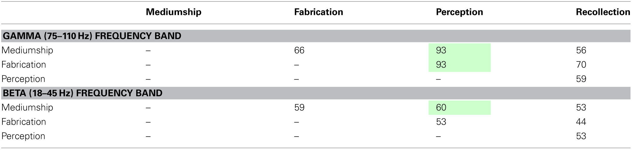 Most prior research on this phenomenon has focused on whether mediums can genuinely report accurate information under blinded conditions, and whether their personalities deviate in significant ways from population norms. But little is known about their physiological and electrocortical processes. Scientists have long proposed and used electroencephalography to study mediums in trance (deeply dissociated) states (Prince, 1968; Mesulan, 1981; Hughes and Melville, 1990; Oohashi et al., 2002; Hageman et al., 2010), but to our knowledge mental mediums who do not experience trance states have not been studied using these techniques. The present study investigated electrocortical activity in six professional mental mediums to explore two research questions: first, correlations between the accuracy of mediums' statements and their brain electrical activity were examined; and second, differences in mediums' brain activity were studied when they intentionally evoked four subjective states: perception, recollection, fabrication, and communication (as described below).
