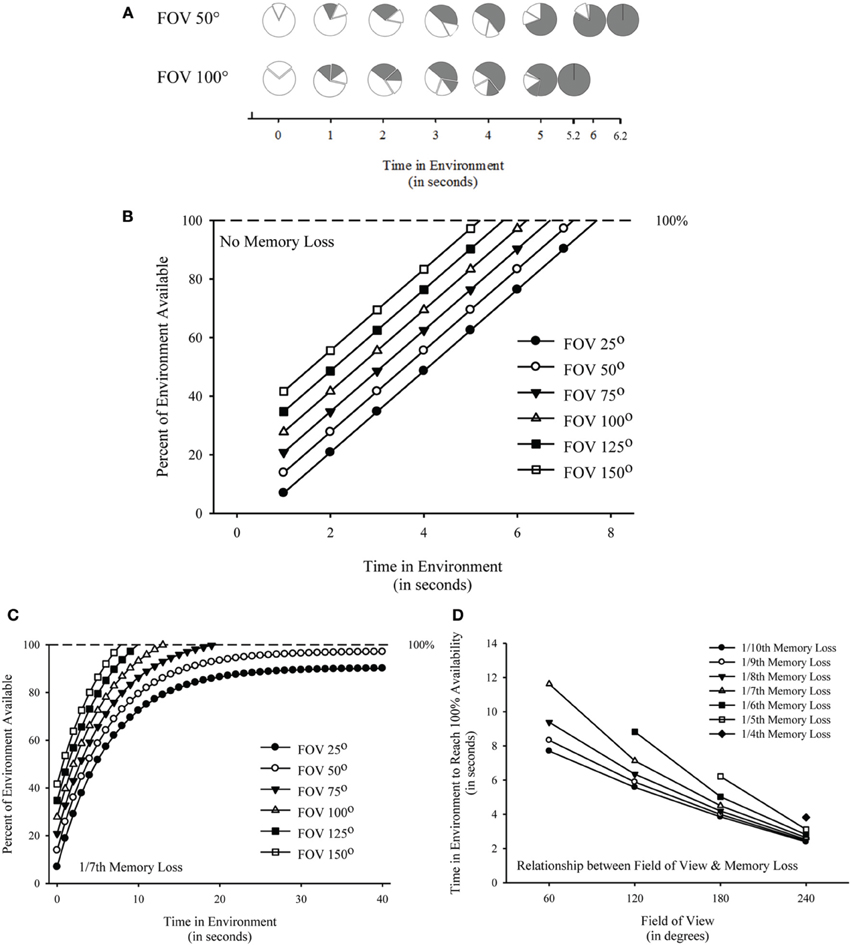 Figure 1. (A) Theoretical illustration of percent of environment available by time in the environment assuming a fixed field of view at the centroid of a circular enclosure with a constant rate of rotation (i.e., 50° clockwise every 1.0 s) and no loss in memory plotted for a field of view of 50° and a field of view of 100°. Exploded regions represent the current field of view. Filled regions represent the amount of environment previously viewed. Unfilled regions represent the amount of the environment that is not yet viewed. Theoretical model of percent of environment available by time in the environment assuming a fixed field of view at the centroid of a circular enclosure with a constant rate of rotation (i.e., 50° every 1.0 s) and no memory loss (B) or 1/7th loss of memory every 1.0 s (C) plotted for a field of view of 25, 50, 75, 100, 125, and 150°. (D) Time in environment to reach 100% availability plotted by field of view for memory loss values of 1/10, 1/9, 1/8, 1/7, 1/6, 1/5, and 1/4th.