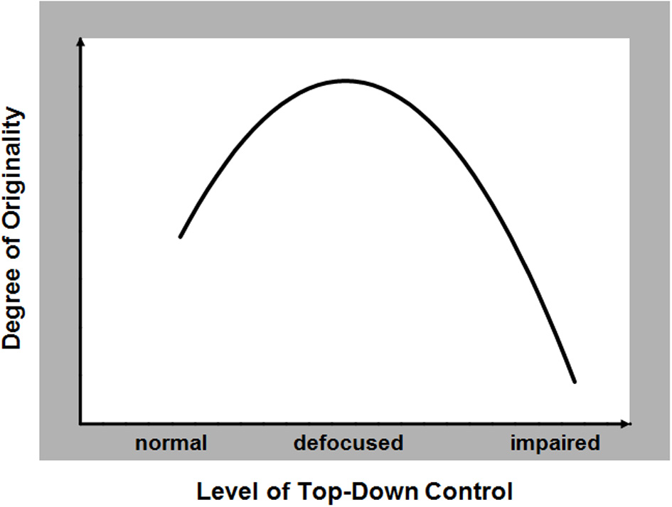 The hypothesized relationship between the capacity to generate original responses during creative thinking (range: low to high) and the degree of functionality in top-down control of information processing (range: normal to impaired).