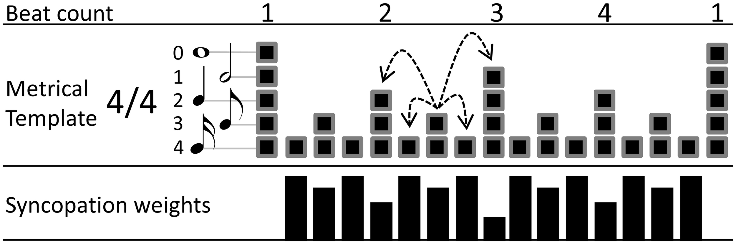 Figure 1. Example of a 4/4 metrical template used in the SG calculation of the amount of syncopation. At the bottom, the syncopation weights for each metrical position are shown as black bars. The dashed arrows depict the amplitude differences for the 8th note of the second beat in the bar, as an example of the amplitude differences taken for each metrcial position during the calculation of the algorithm.